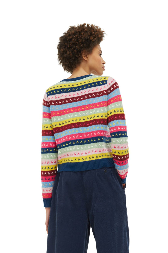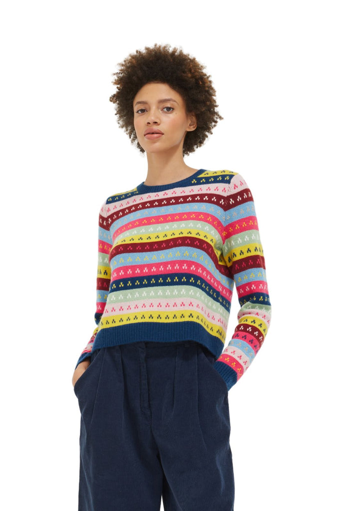 This rainbow-striped sweater is the perfect top to brighten any winter day. It's soft, flattering, and versatile. You can dress it up with trousers or go for a more casual look with your favorite pair of jeans.