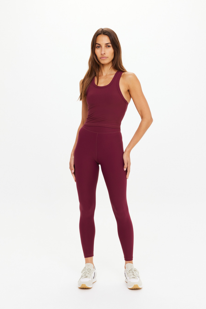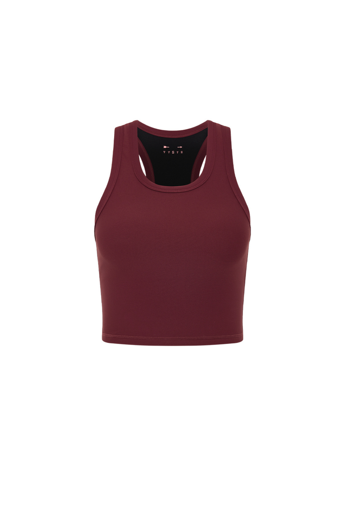 A longline racerback crop in maroon designed for smooth, second-skin comfort and everyday support. Finished with The Upside’s signature arrow logo in neon pink at the back, it offers a clean, flattering silhouette with mid coverage.
