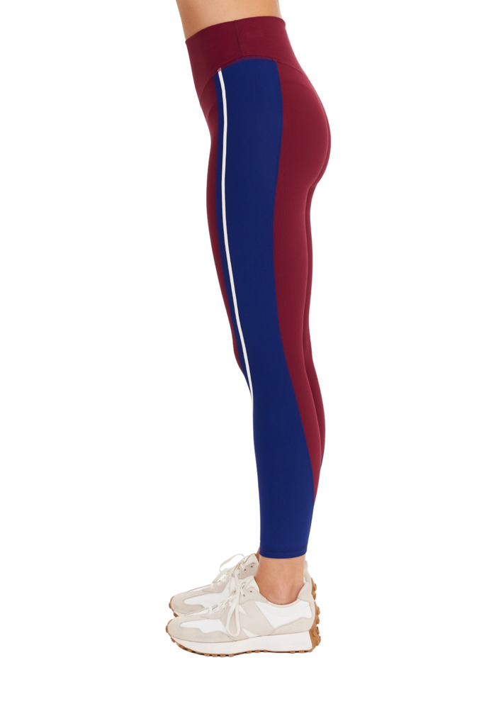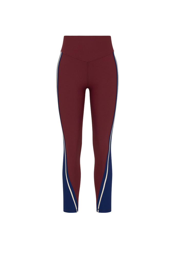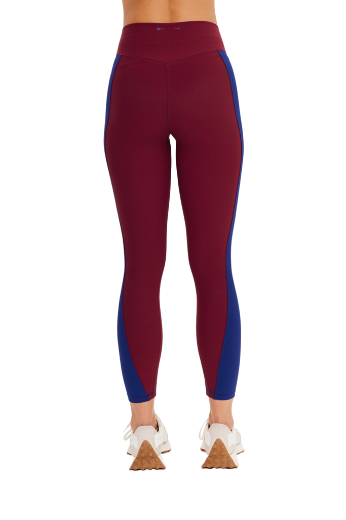 High-rise midi pant with a 25" inseam, featuring a V-panel waistband in merlot. Designed with navy color-blocked panels, cream binding, and a recycled textured rib fabric with moisture-wicking properties.