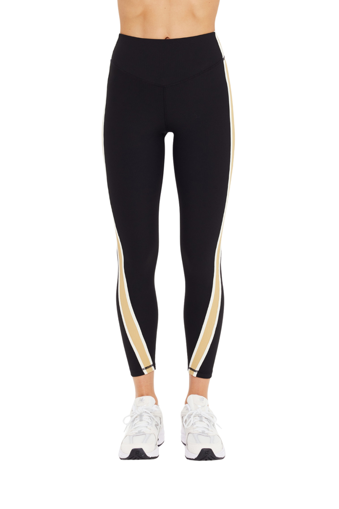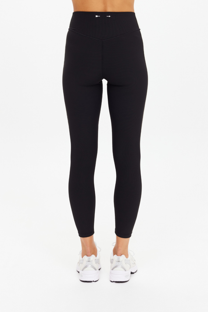A sculpted high-rise silhouette with sharp side detailing for a refined, sport-forward finish. This 25" midi length is crafted in supportive recycled rib fabric for a firm, contoured feel. Finished with a tan contrast panel, cream binding, and a printed arrow logo at the back for a clean, modern statement.