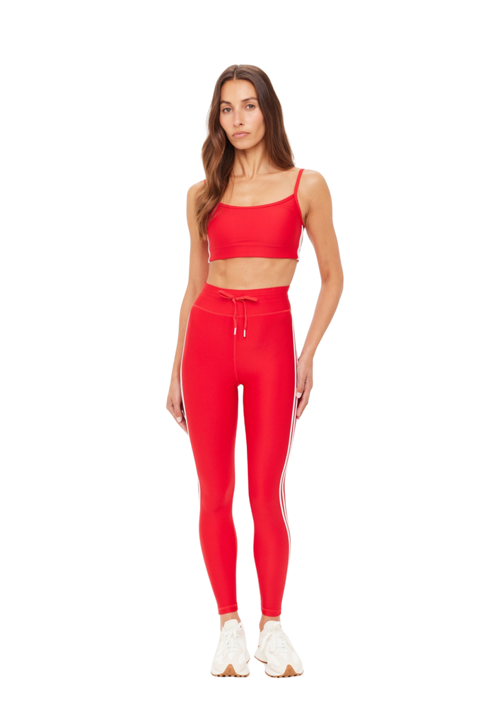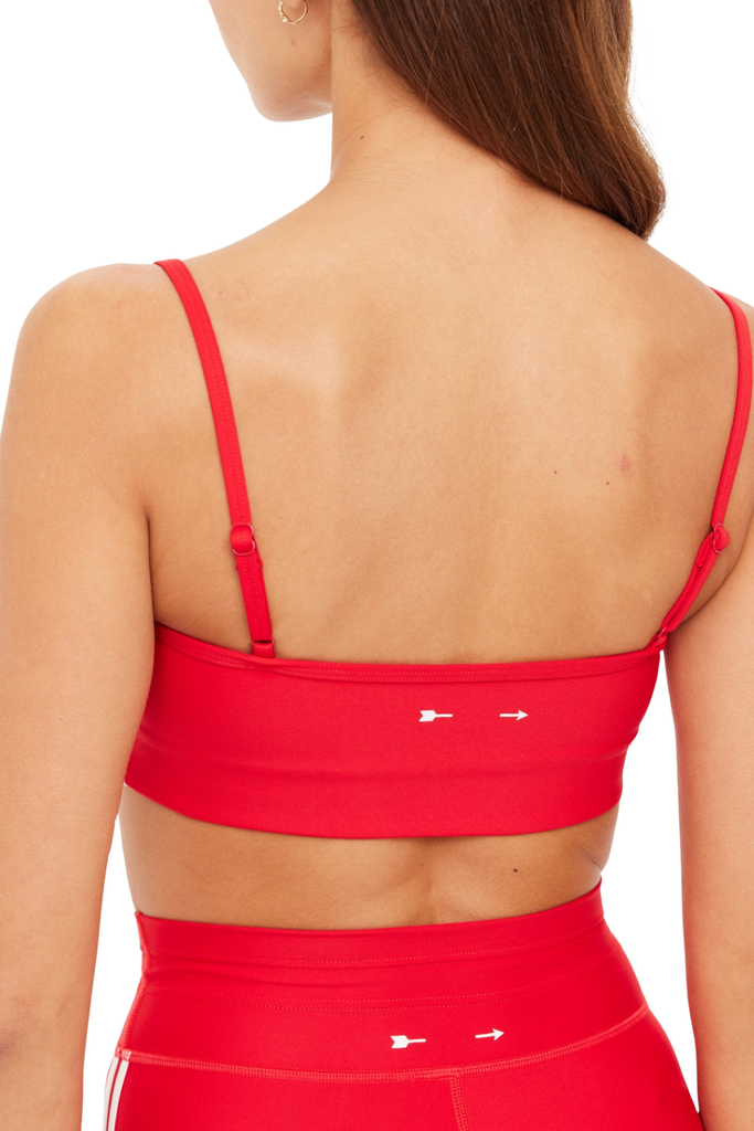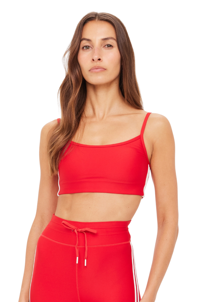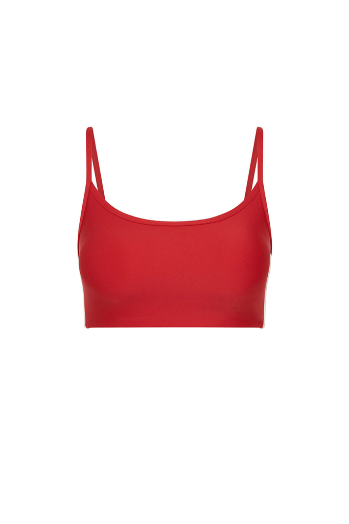 The Oxford Hutton Scoop Bra features a mid-coverage fit with a scoop front and back neckline in cherry red, finished with cream side binding and adjustable straps for a refined, supportive feel.