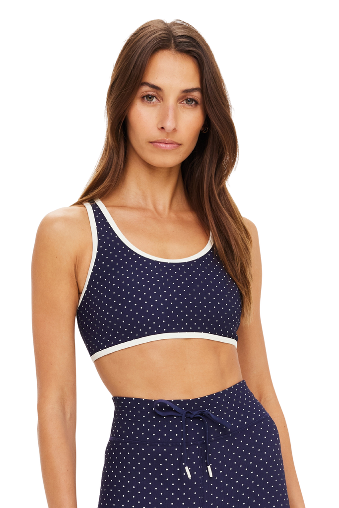 A full-coverage silhouette designed with a bold, after-dark edge. Featuring a scooped racerback and rendered in a navy and cream spellbound spot print, it’s crafted from supportive recycled rib fabric for a sculpted feel. Finished with contrast cream binding, removable cups, and a printed arrow logo at the back neck for a refined performance touch.