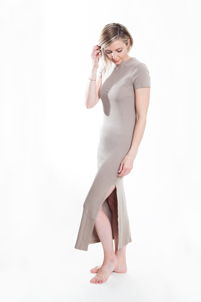 An effortless outfit, this t-shirt dress from Stateside is flattering, subtle, and soft. We love to layer it with a cashmere cardigan and slides for a quick put-together look.