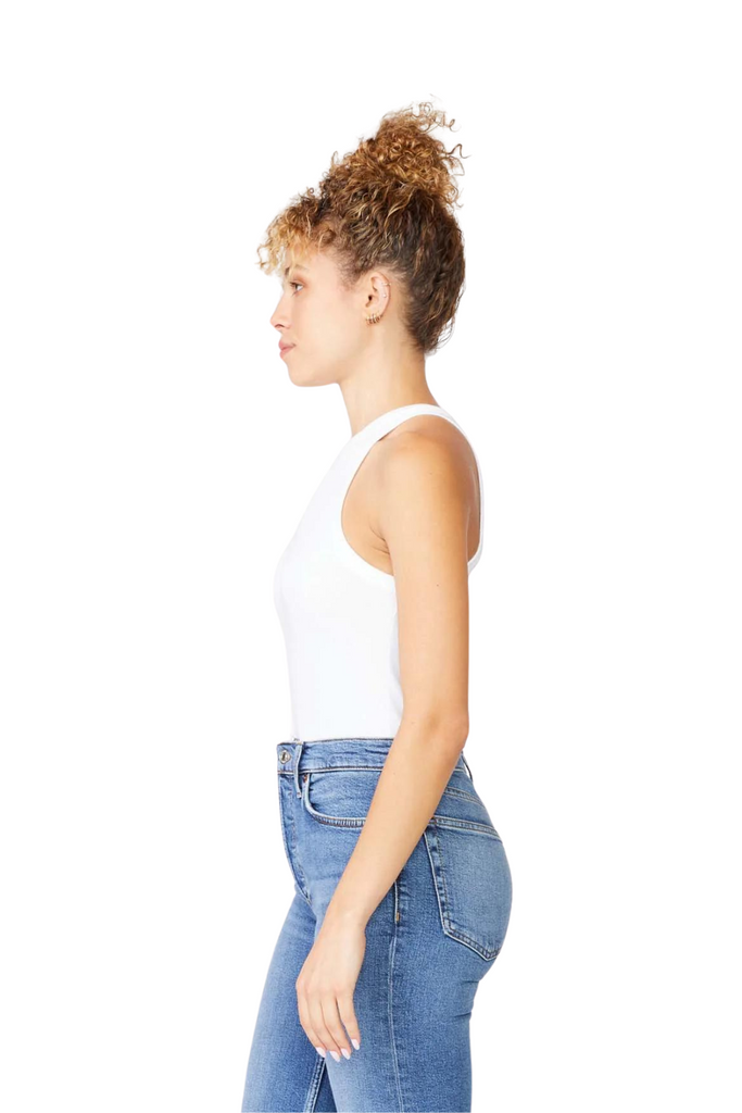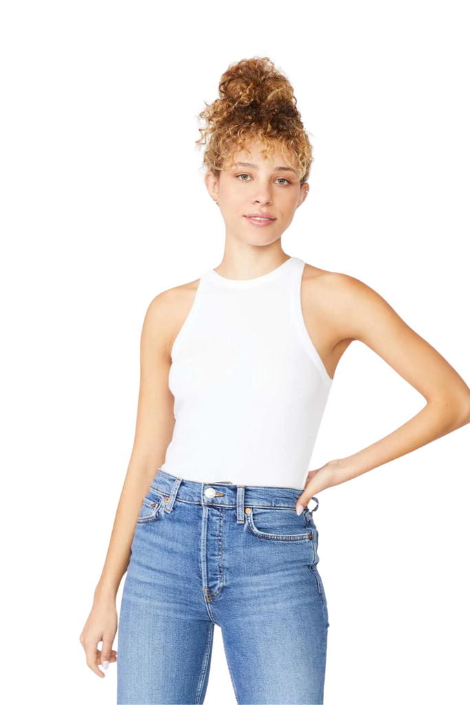 This tank is slim-fitting with a stretchy ribbed design. This tank features a high neckline in both the front and back, along with our distinctive baseball stitch under the back collar.