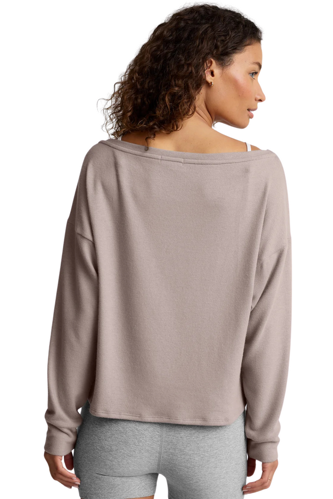 With its wide neckline and draped silhouette, this off-the-shoulder top channels an effortless “just left ballet class” elegance. Crafted from Beyond Yoga’s signature Spacedye fabric with cashmere-like softness, it layers beautifully over your favorite bra—perfect for coffee runs, cozy moments, or a polished post-class look.