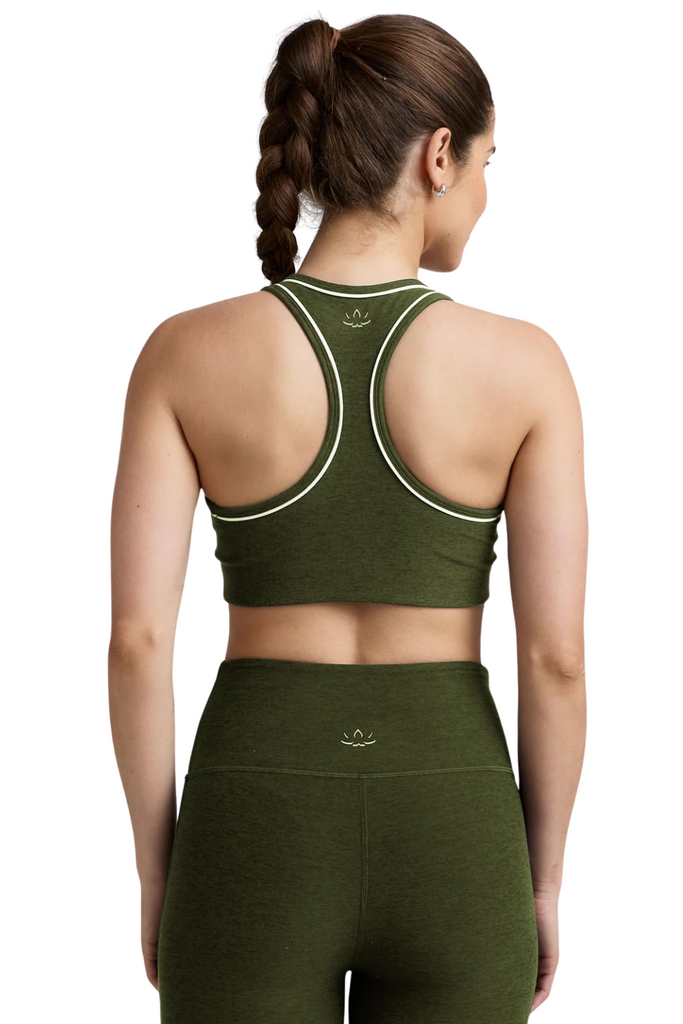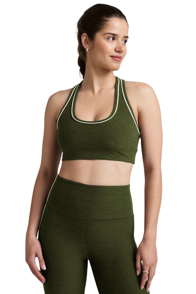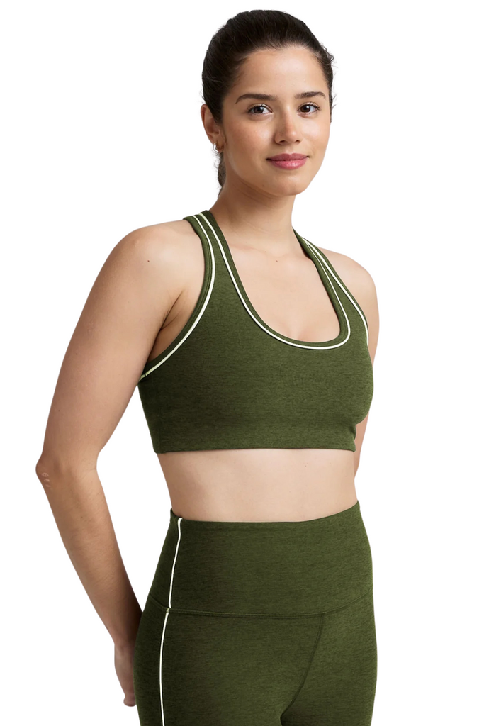 Equal parts sporty and refined, this scoop neck bra is designed with a wide racerback for support and ease. Crafted in Beyond Yoga’s signature soft performance fabric, it’s finished with retro-inspired piping that brings a polished, preppy touch—perfect for studio sessions or outdoor adventures alike.