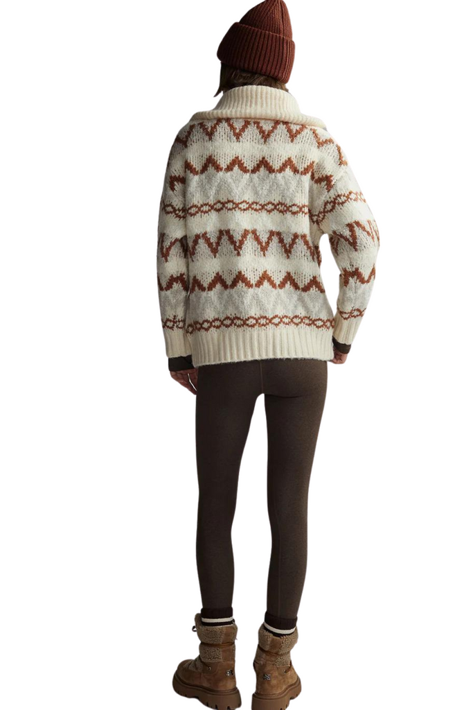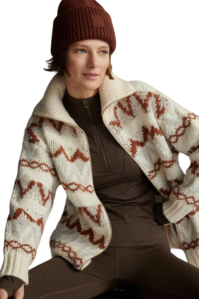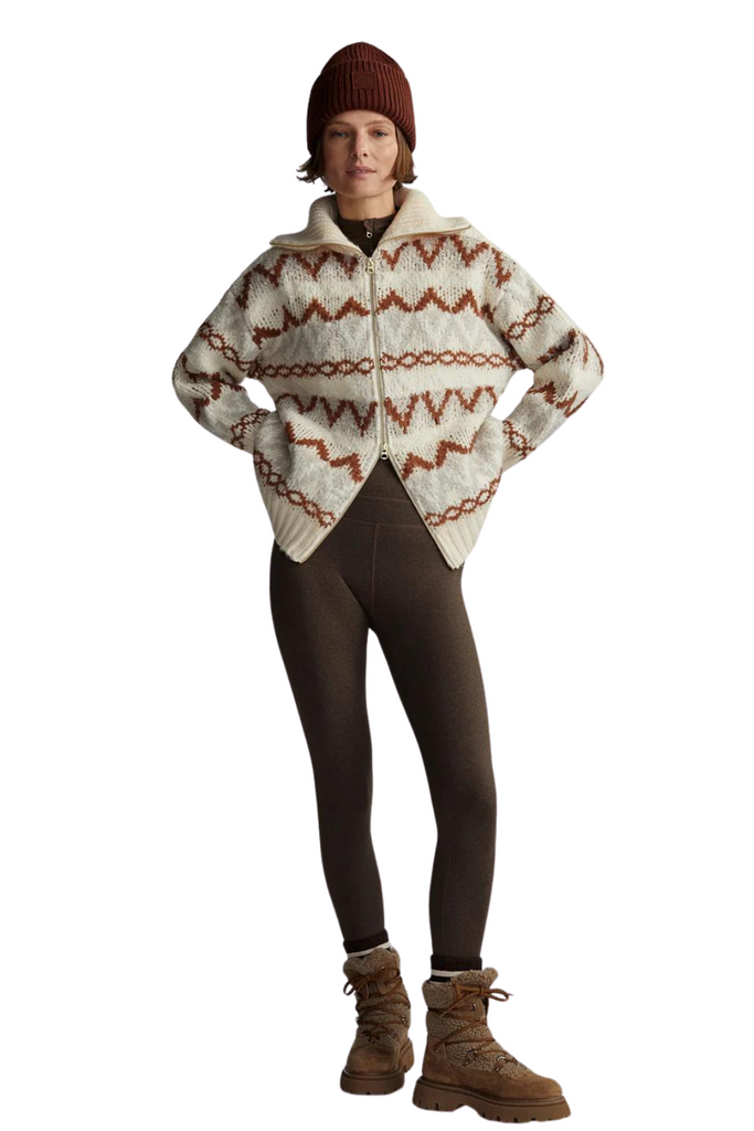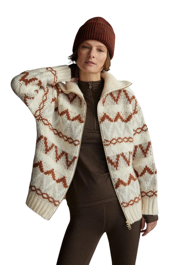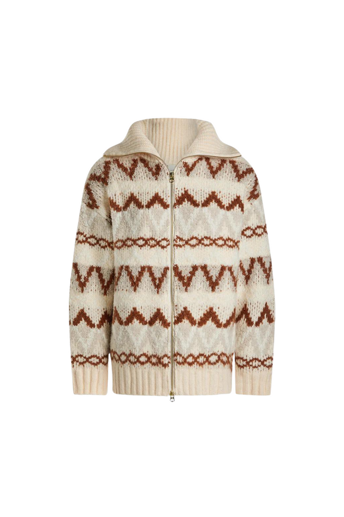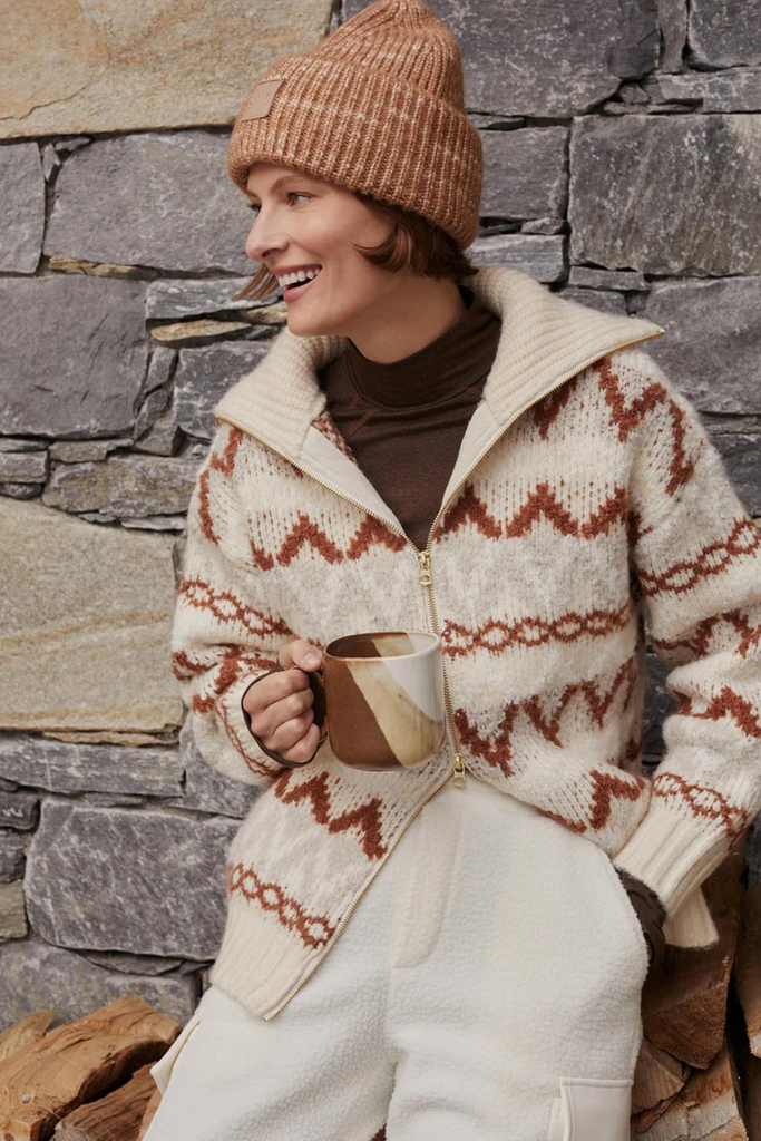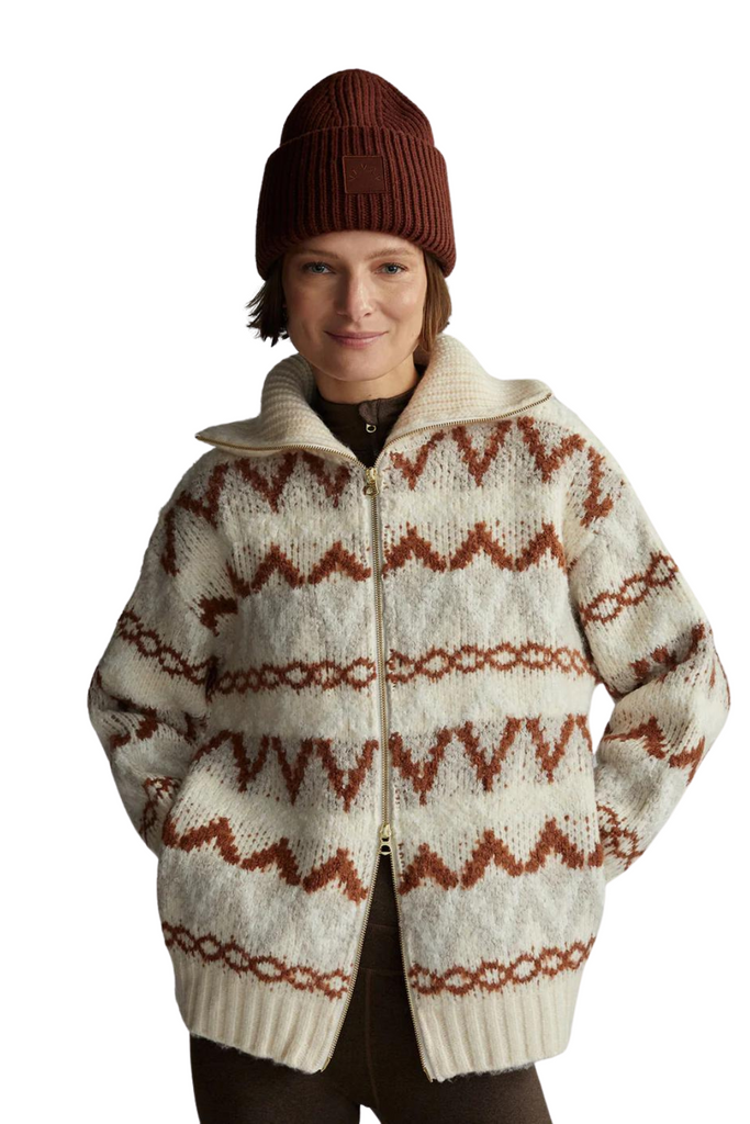 Keep fashionably cozy in the generously-sized and luxuriously plush Brooke Fair Isle knit jacket – a standout winter layer. Crafted from a sumptuous blend of soft fabrics, this oversized winter essential ensures both warmth and style. Boasting a larger collar and chunky ribbed trim to ward off the winter chill, the jacket is elevated with a contemporary V monogram Fair Isle design.