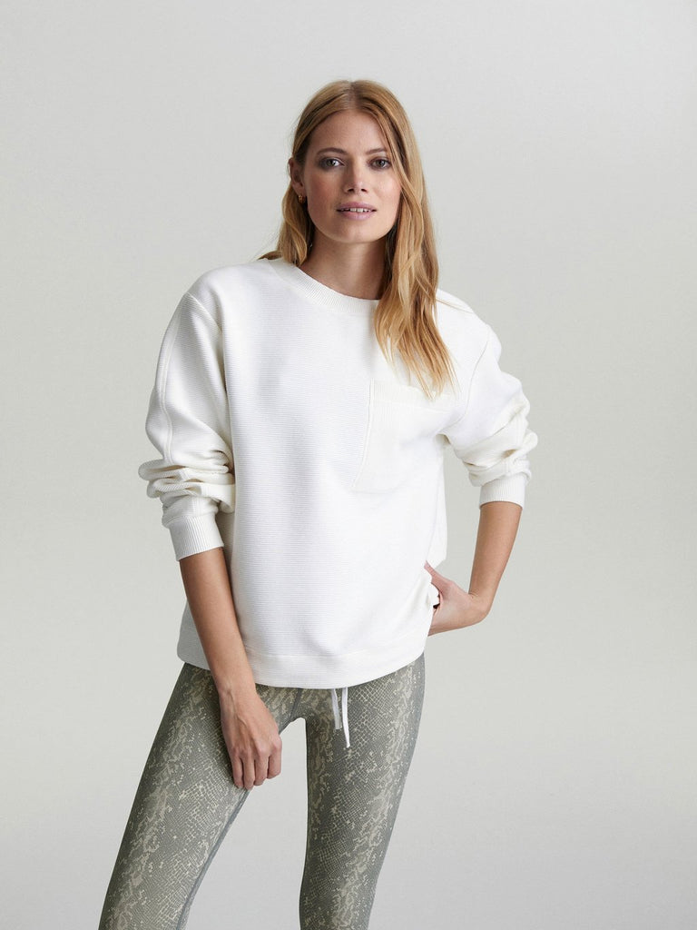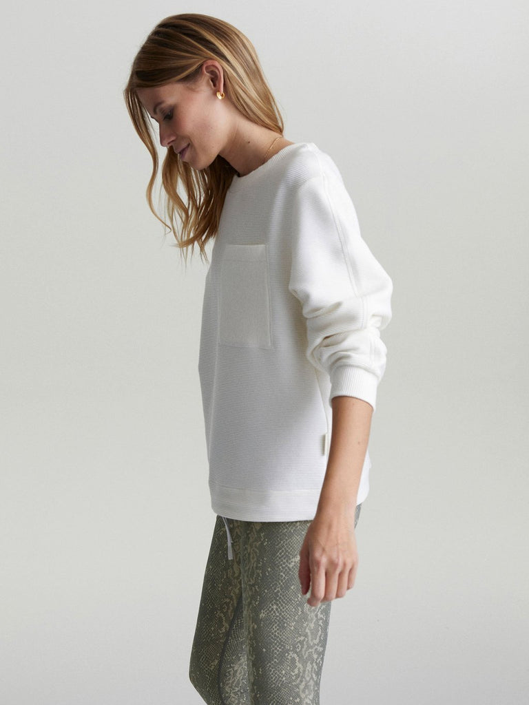We love this easy layer from Varley. The structured fabric is comfortable and elegant. We love the slight crop and beautiful texture.