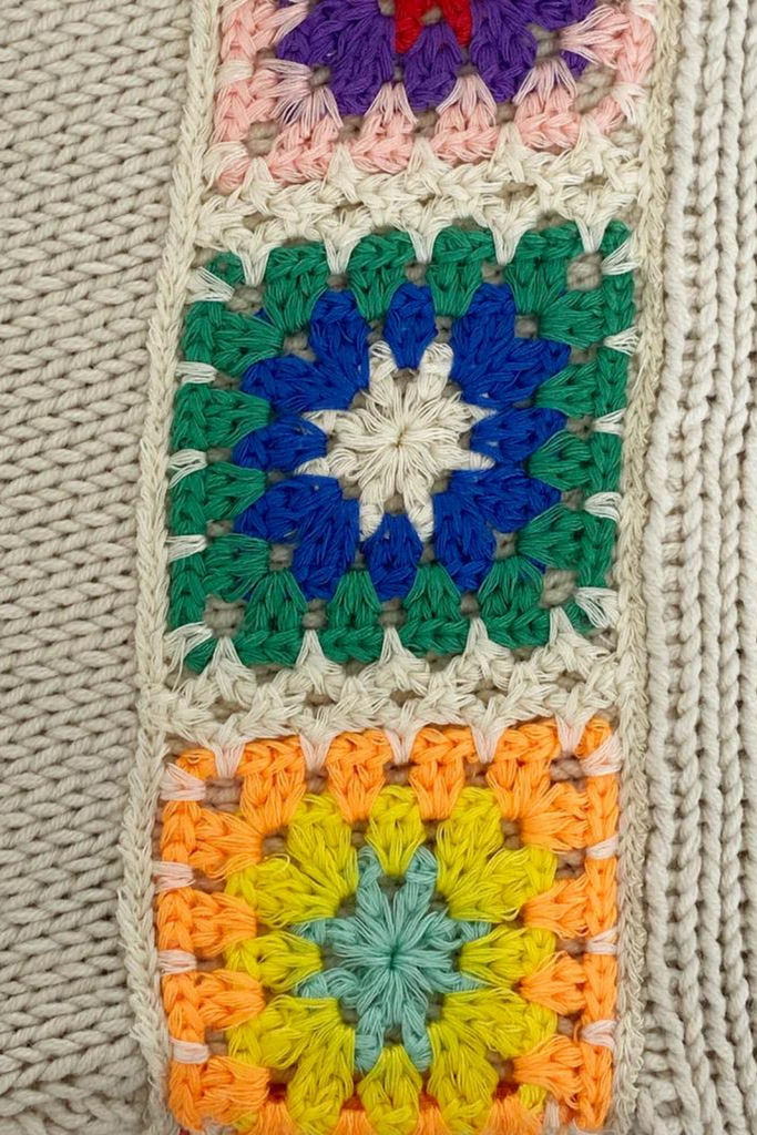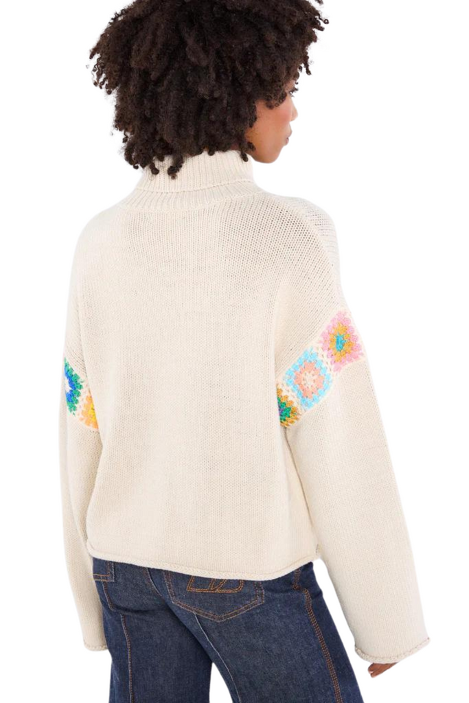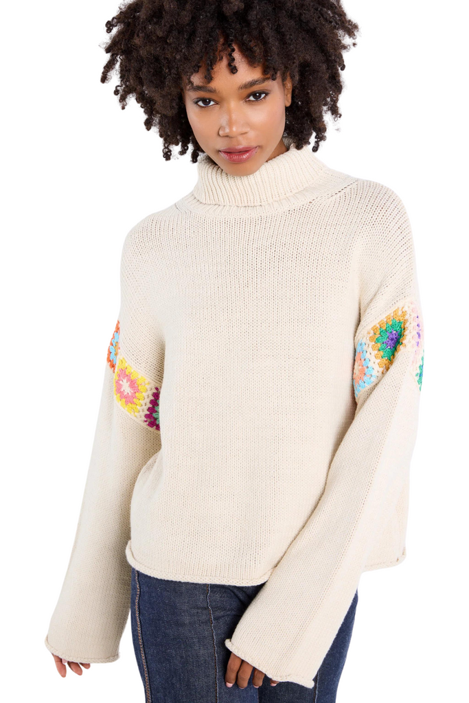Elevate your style with intricate details. The In The Loop pullover turtleneck sweater boasts full sleeves adorned with a vibrant, hand-crocheted band.