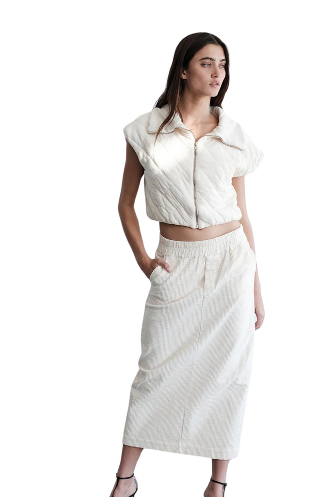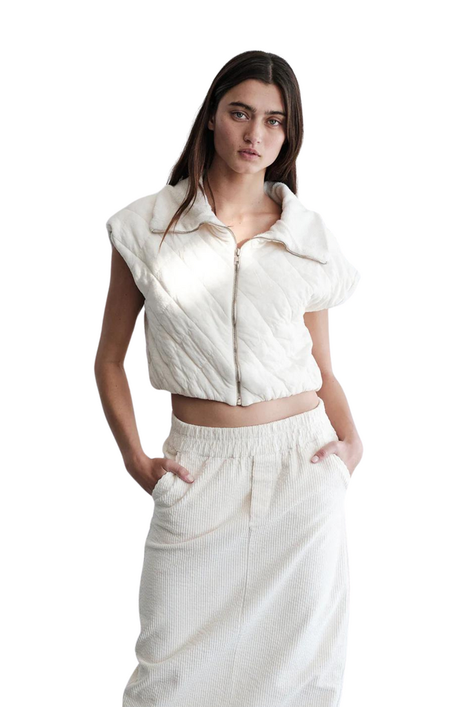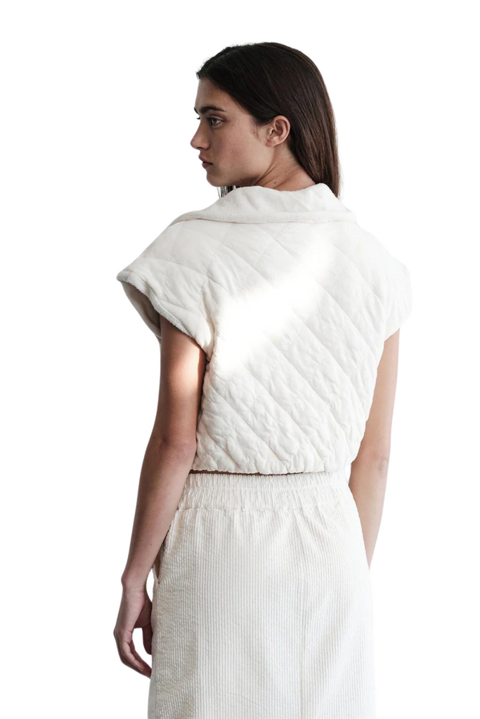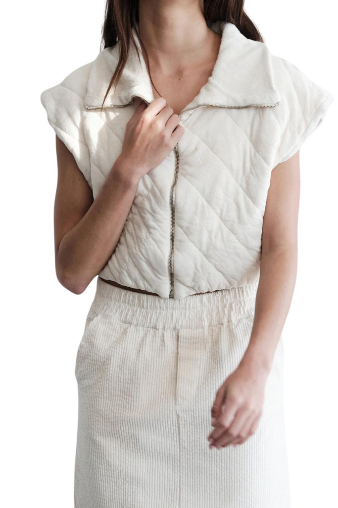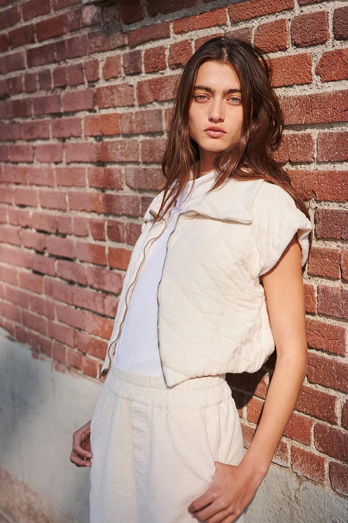 Tailored for a cropped silhouette, this quilted vest combines lightweight comfort with coziness, making it the perfect layer for transitioning into cooler temperatures. The easy zip-up front ensures convenient wear, and the classic collar adds both style and warmth.