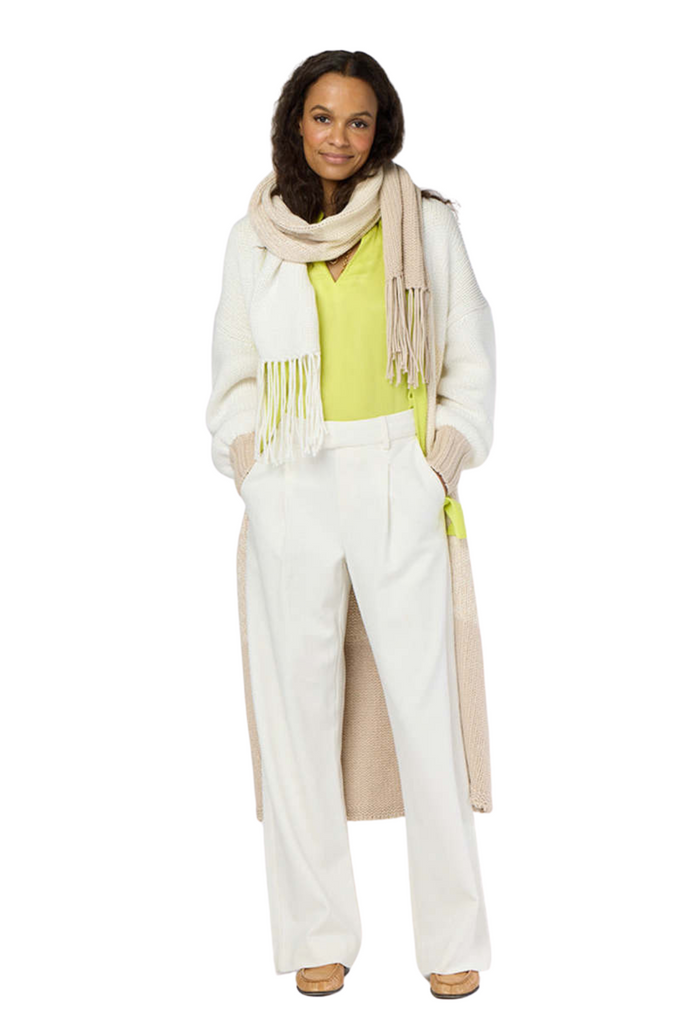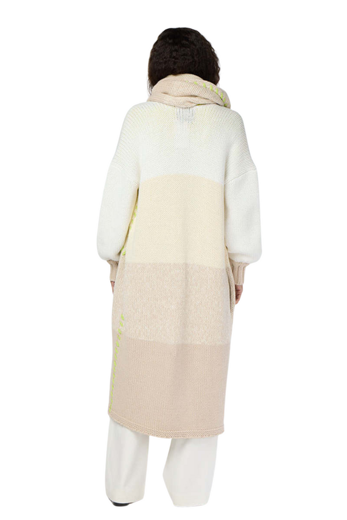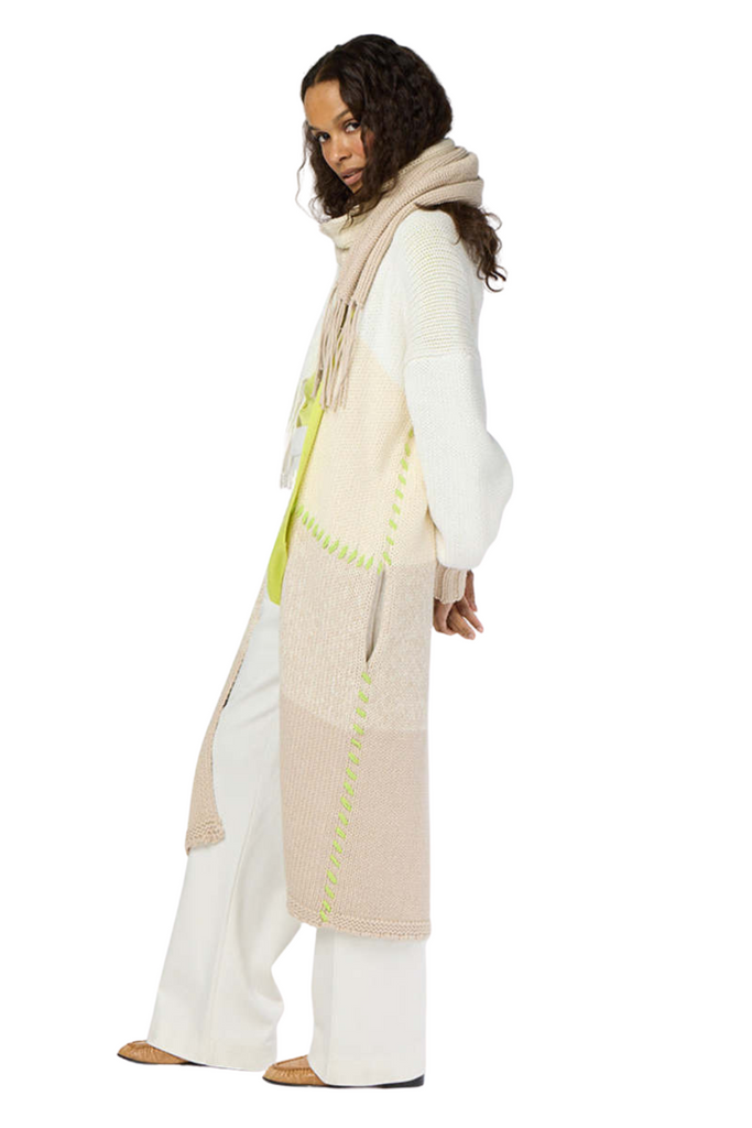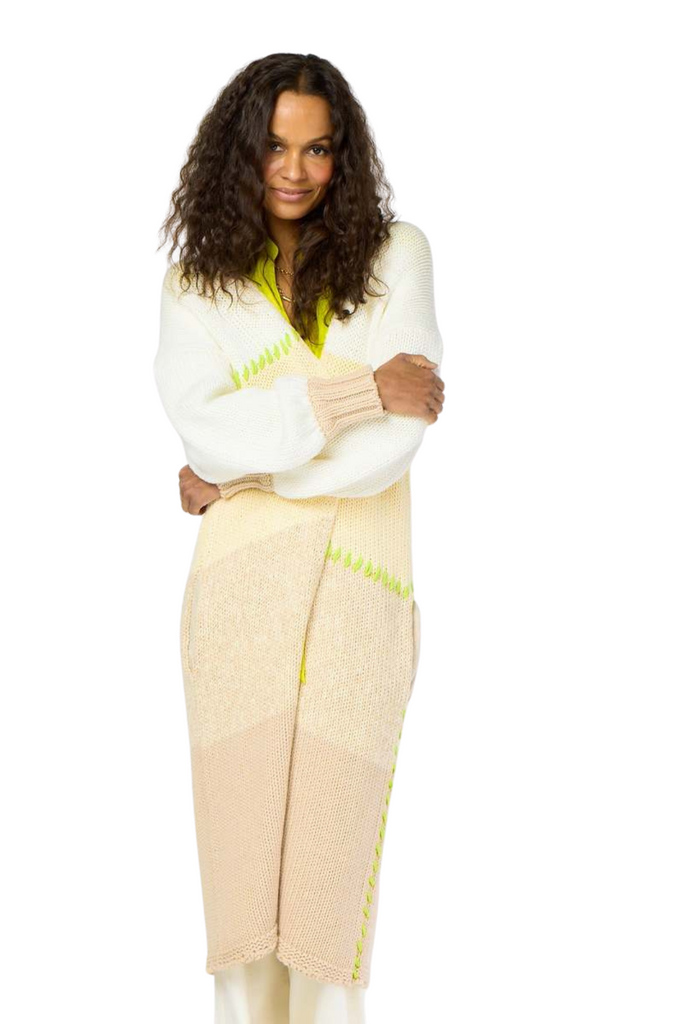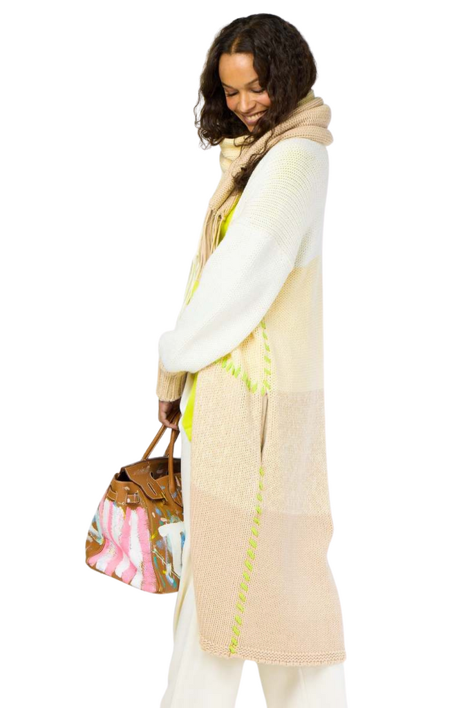 The Alaina Stripe Duster is knit from 100% soft cotton in off-white, beige, and sunny hues, finished with whip stitch detailing. A versatile neutral layer, perfect for cozy moments or stepping out in style.