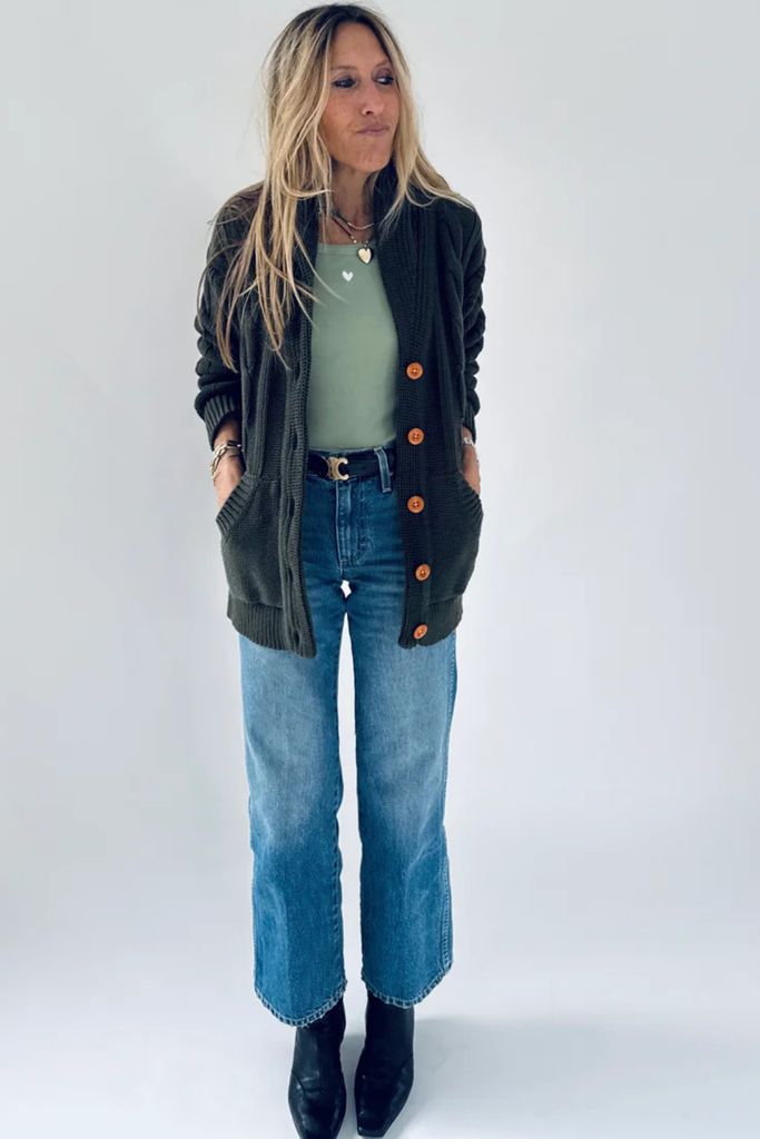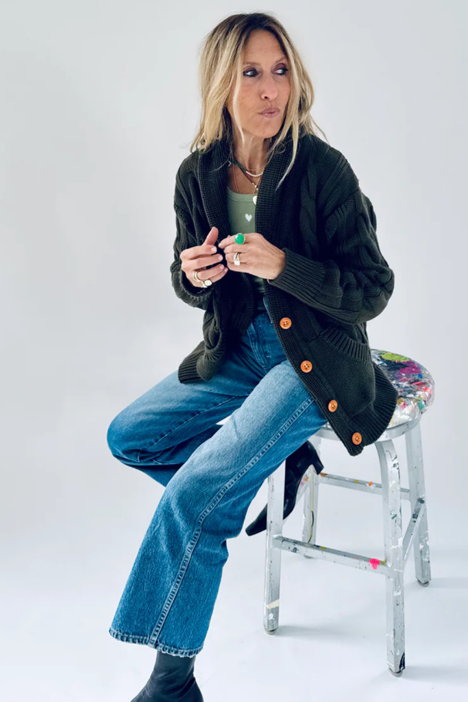 The Shawl Collar Helen Heart Cardigan is crafted in a soft cotton-cashmere cable knit, designed to be a standout layering piece. Featuring Kerri’s signature Drippy Heart appliqué on the back with contrast braided detailing, this cardigan blends playful artistry with timeless comfort. A subtle embroidered love note on the sleeve adds a thoughtful finishing touch. Style effortlessly with a fitted tank and your favorite denim or trousers for an easy, everyday look.