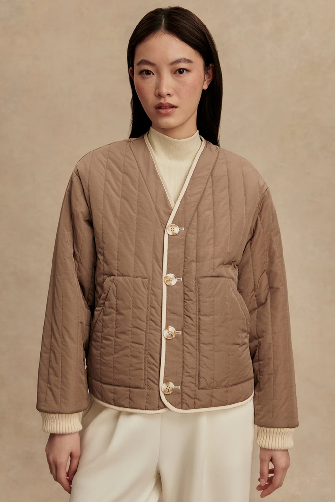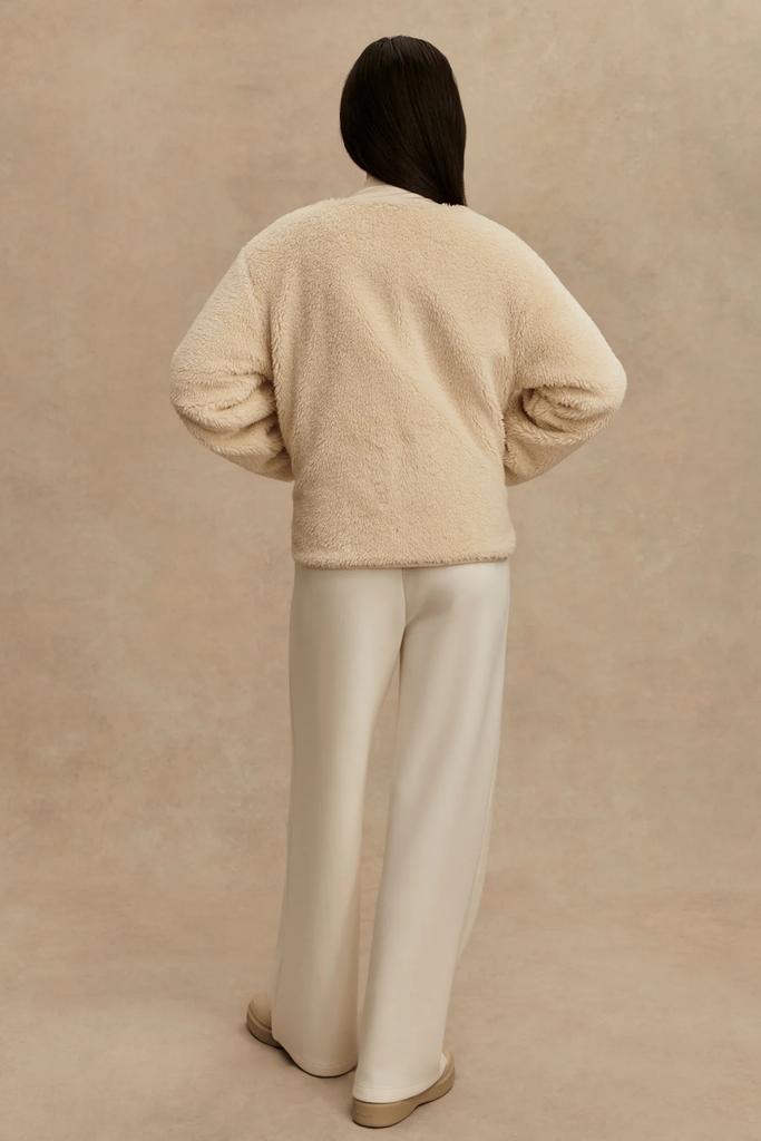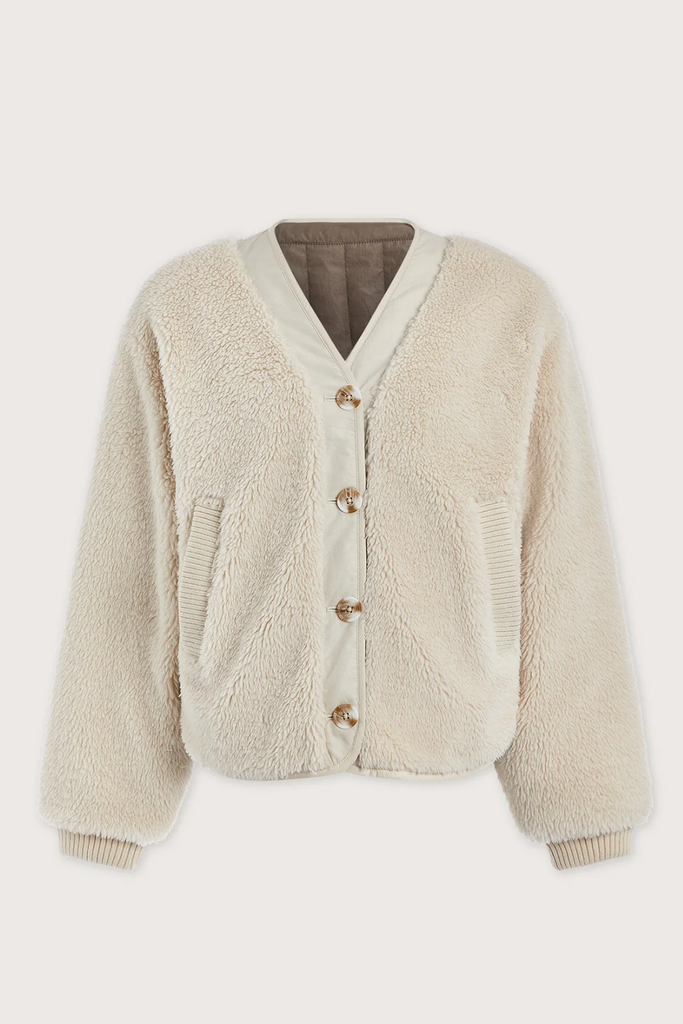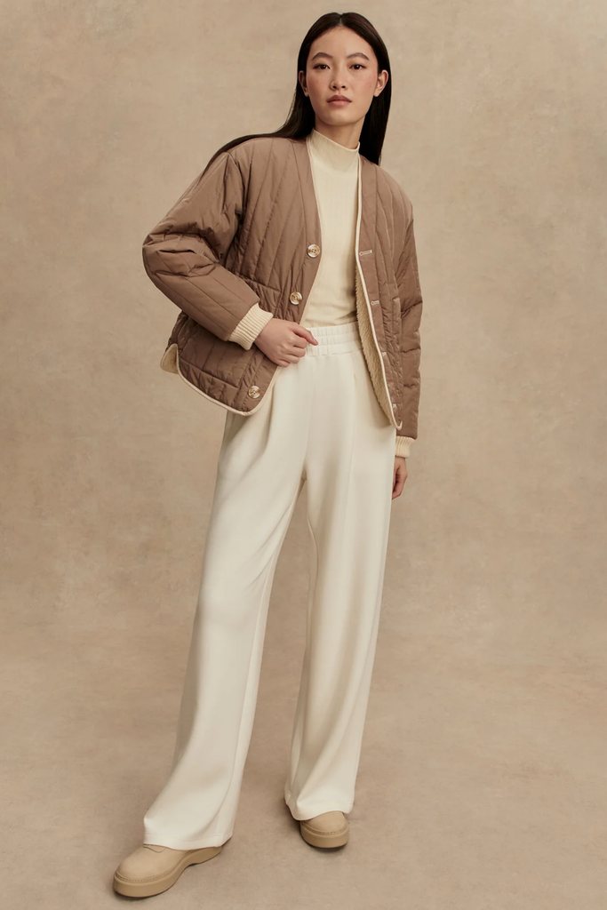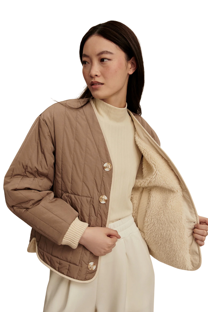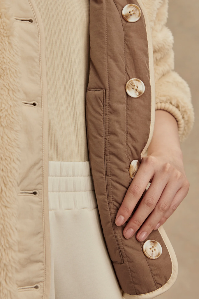 The Drew Jacket by Varley is an effortless layering essential designed for cooler days. Reversible for versatile styling, it features plush sherpa on one side and an elegantly quilted crinkle shell on the other. A modern, cardigan-inspired silhouette is finished with button closures, ribbed cuffs, patch pockets, and contrast binding for a refined touch.