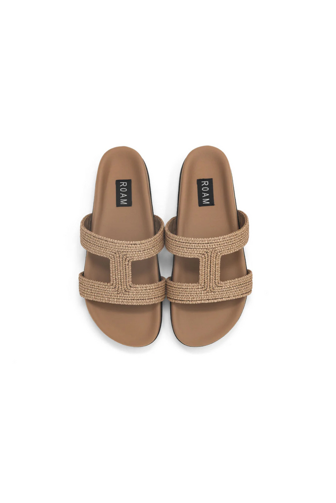 ROAM’s ‘Raffy Cuffs’ sandal blends earthy texture with modern design, featuring handwoven raffia cutout straps that frame the foot and a soft neoprene lining for comfort and moisture control.