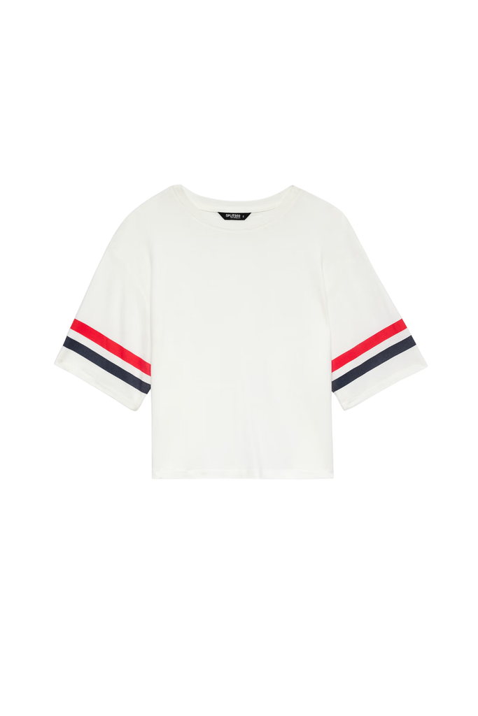 An easy, year-round essential designed with a casual, relaxed fit. Finished in clean white with sporty sleeve stripes, it delivers a timeless athletic feel. Wear it on its own or layer effortlessly over your favorite performance pieces.