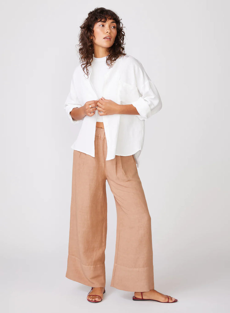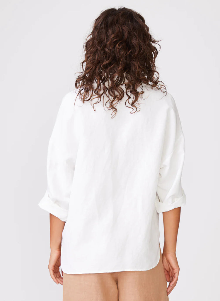 A classic white linen button-down with a fun twist; this lightweight top will surely become a closet staple with its clean lines and flattering shape.