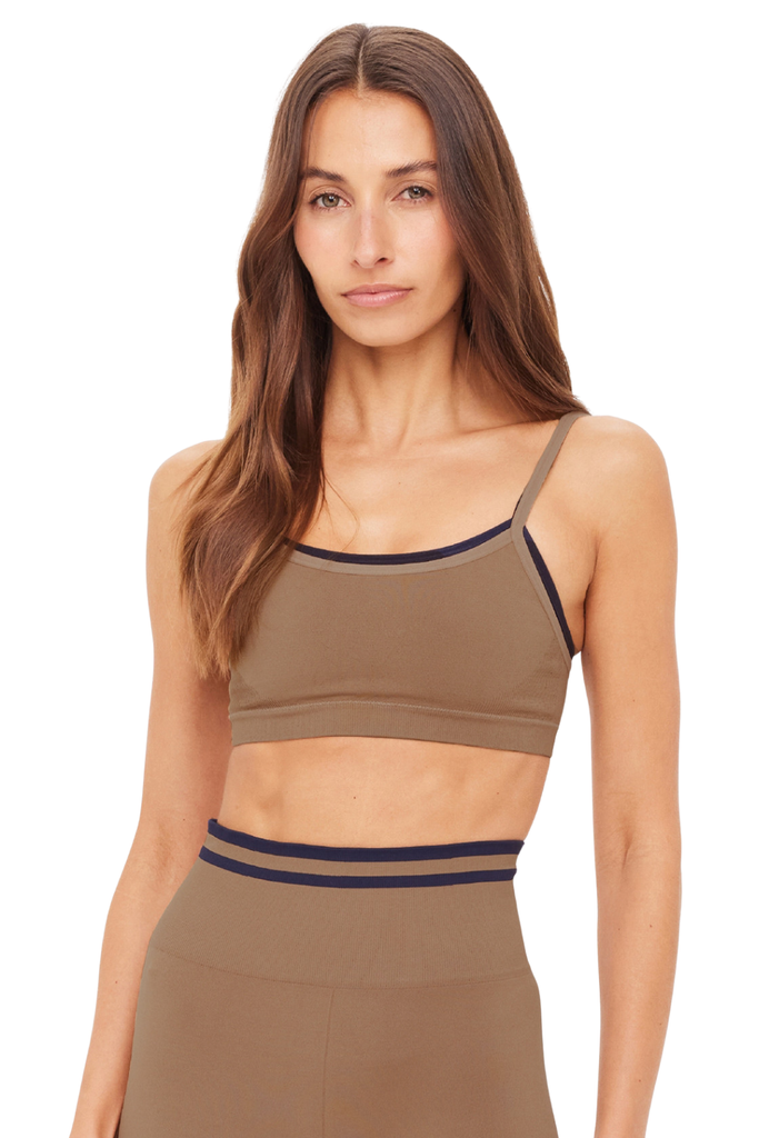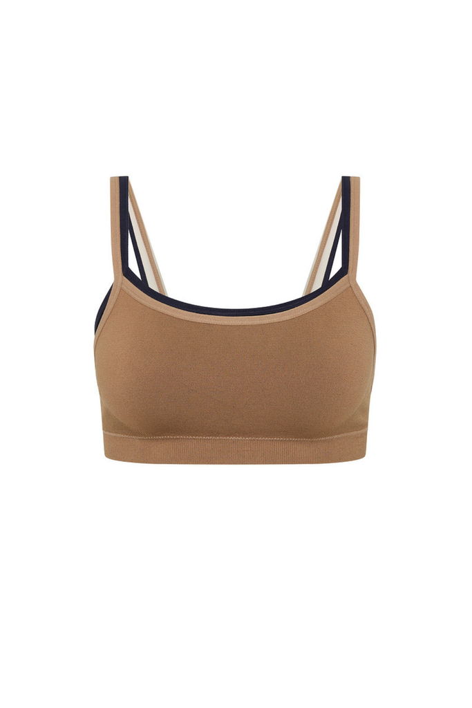 A double-layer seamless bra in a rich mocha tone, finished with a contrast navy underlayer for added support and dimension.