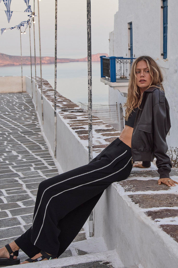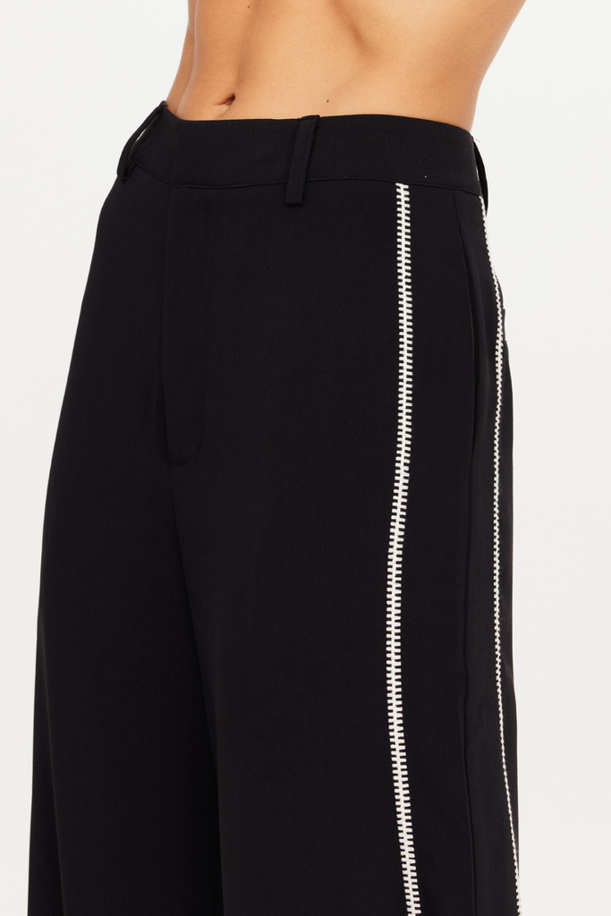 A high-waisted, wide-leg silhouette that blends modern tailoring with effortless wear. Designed with a structured waistband, fly zipper, and belt loops, it’s crafted from recycled woven polyester for a polished yet comfortable feel. Finished with side and back welt pockets, cream embroidery along the side seams, and a tonal embroidered arrow logo at the back for subtle distinction.