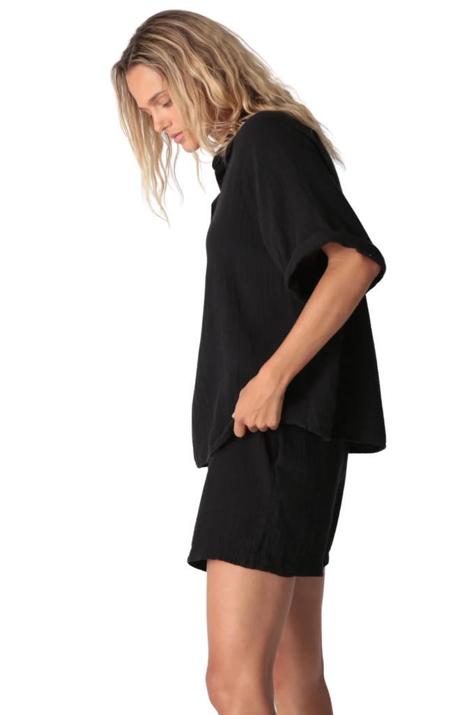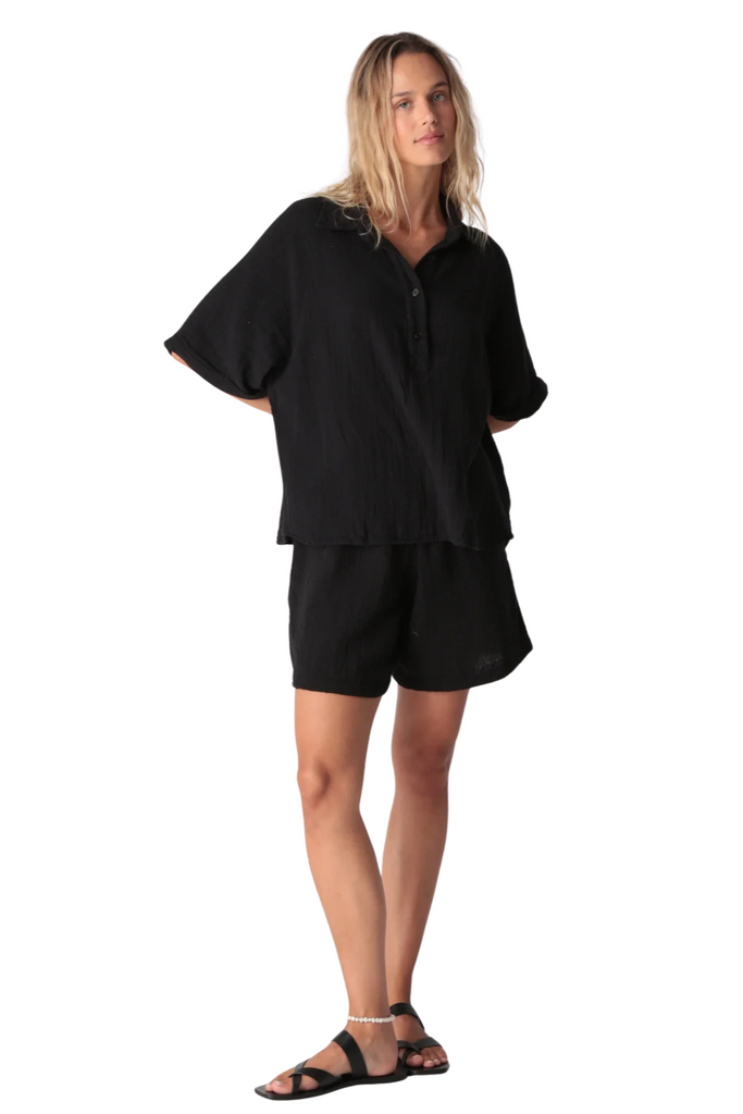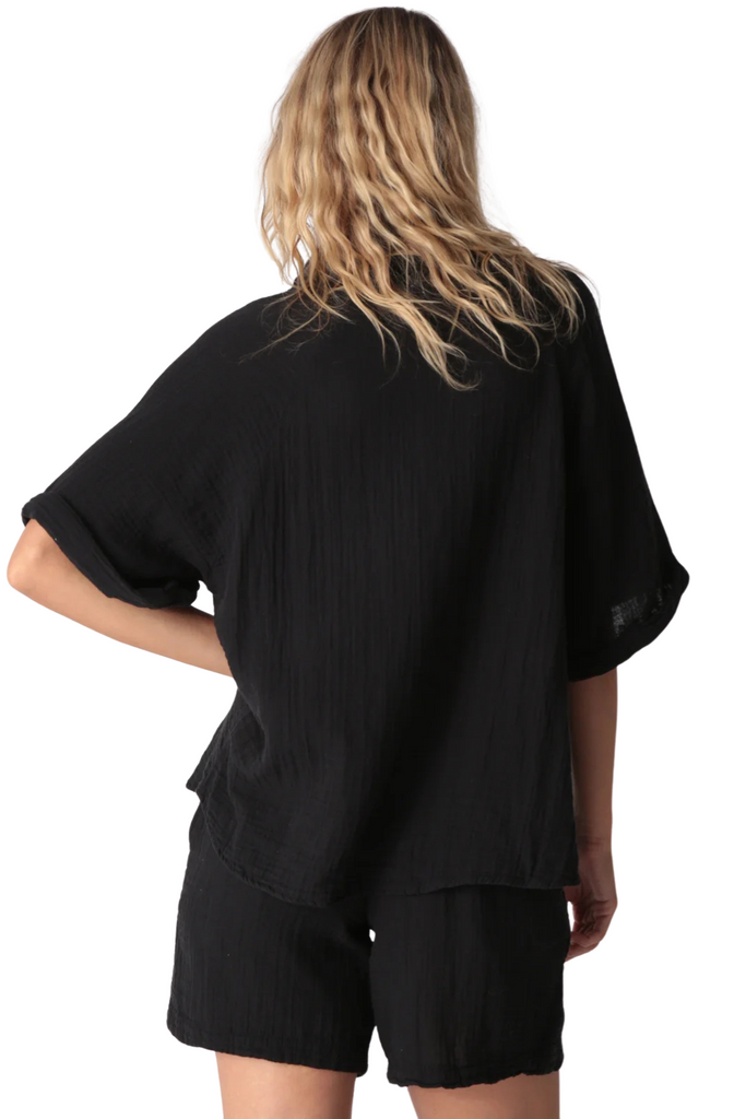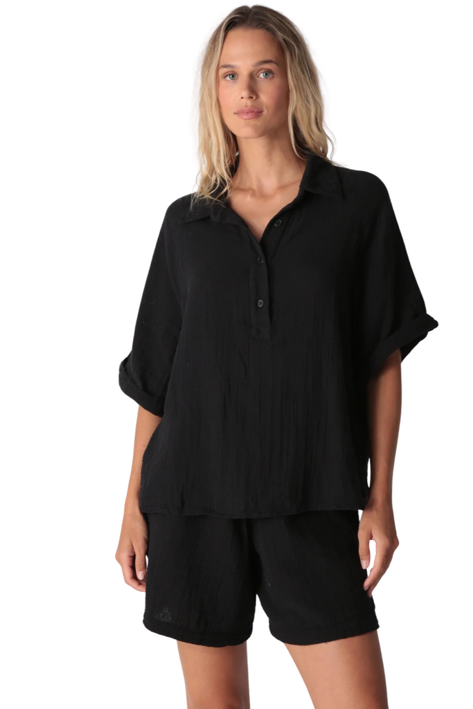 Breezy and effortless, the Kauai Top is crafted from lightweight gauze for easy, warm-weather wear. Designed with a classic collar, v-neckline, and cuffed short sleeves, it drapes beautifully whether styled loose or tucked for a polished finish.
