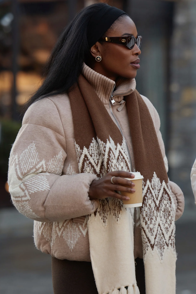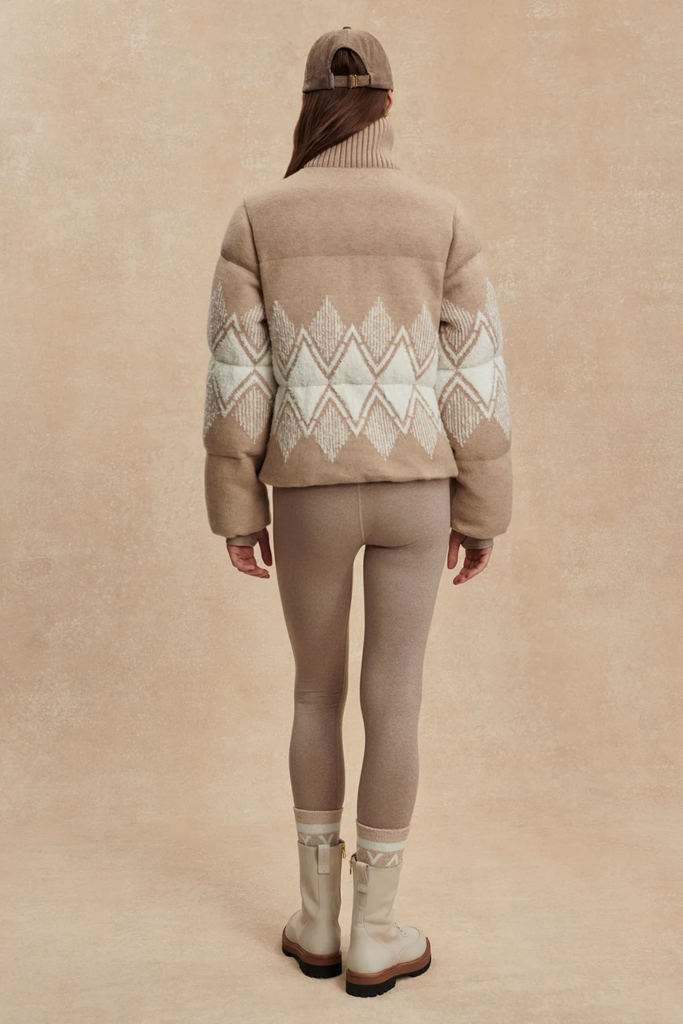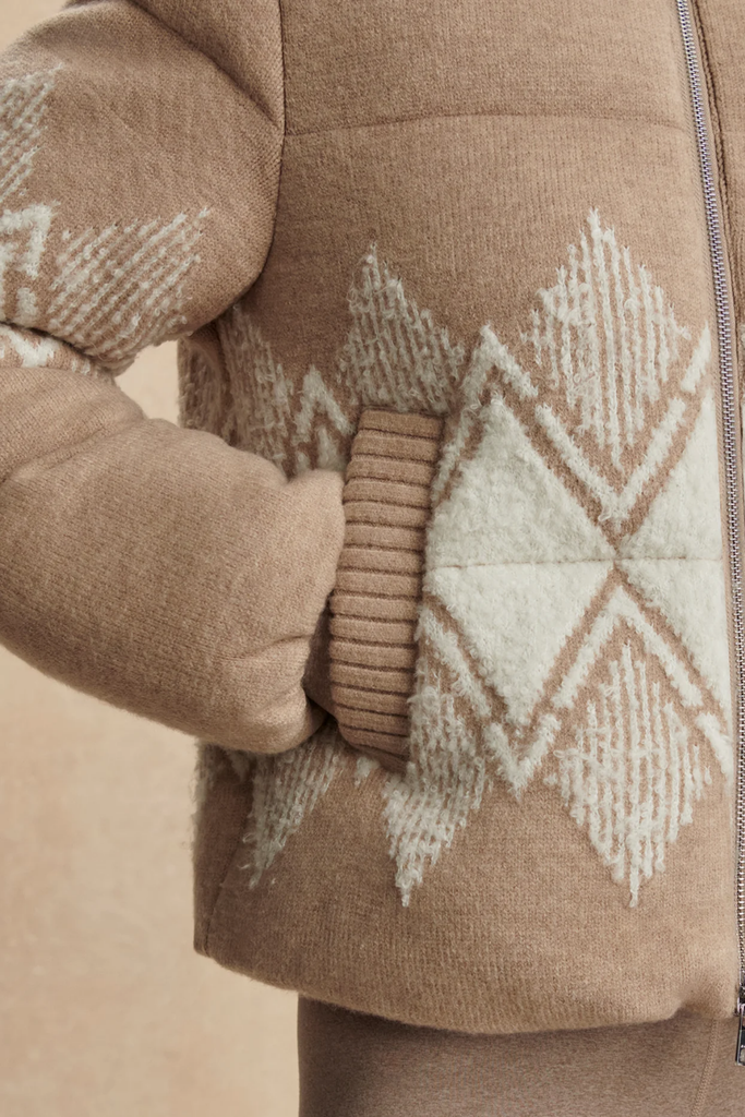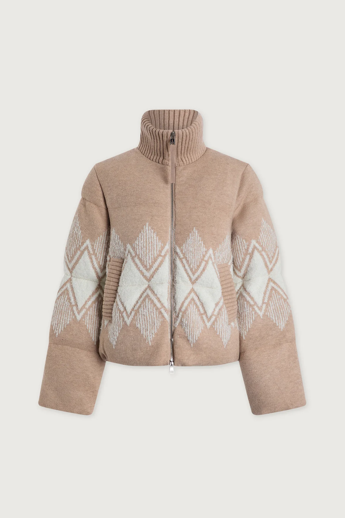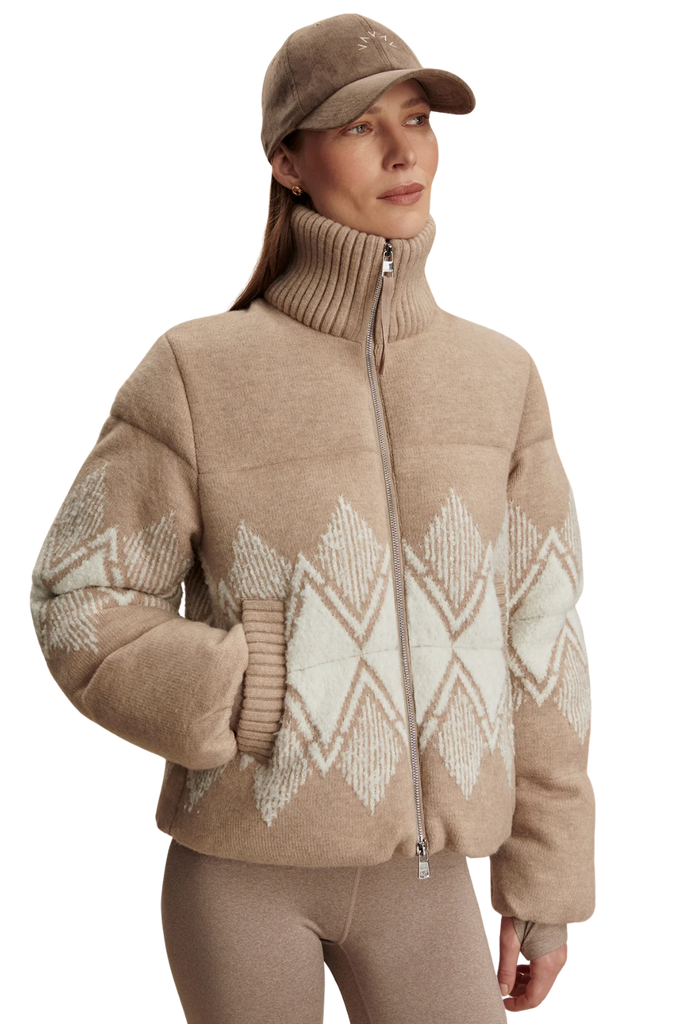 The Belinda knit puffer blends Alpine charm with a contemporary, slightly cropped silhouette. Crafted in textured bouclé knit with a jacquard diamond pattern, it features Varley's insulating DuPont Sorona® fill, a high knitted collar, and practical pockets.