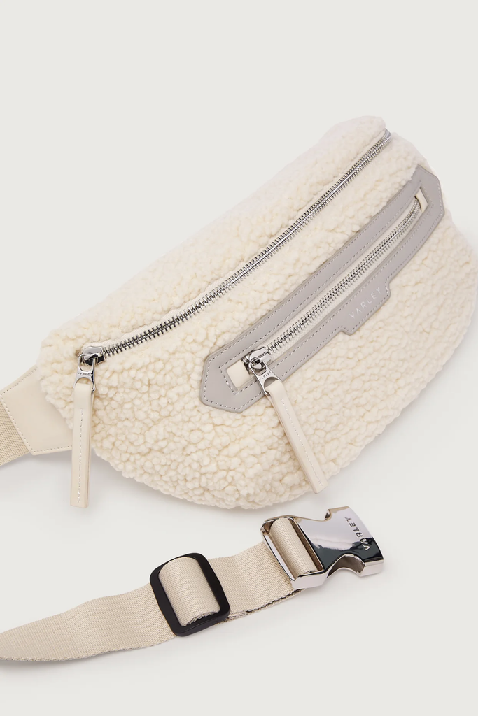 Inspired by the Lasson belt bag, the Kansa bag is crafted in warm, textured Sherpa, featuring a sleek webbing strap, multiple compartments, and branded buckle and zipper details for a modern look. A cool-weather twist on an everyday essential, keep your valuables close with the Kansa Sherpa belt bag.