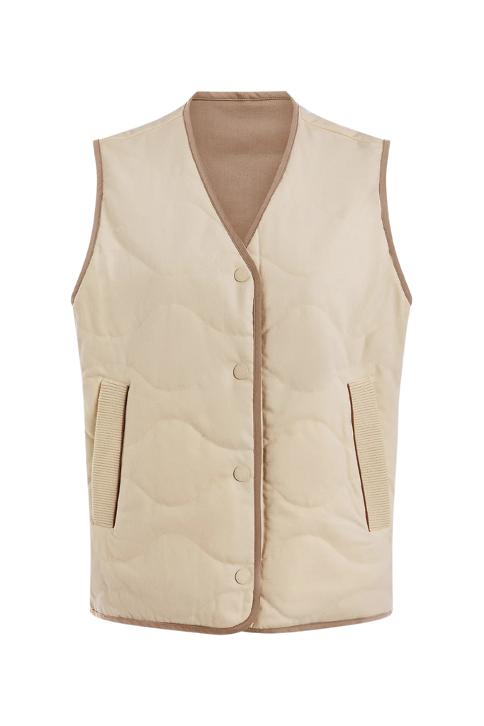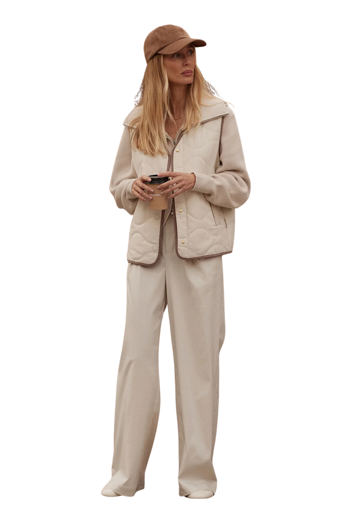 The Lori Gilet is the perfect layering piece for fall, effortlessly worn over chunky knits or lightweight long sleeves. Designed with versatility in mind, it features a reversible construction: one side in Soft Flannel with an onion quilt, contrast binding, and knitted rib pockets, and the other in Soft Touch Twill with a subtle sheen for a minimalist, polished look.