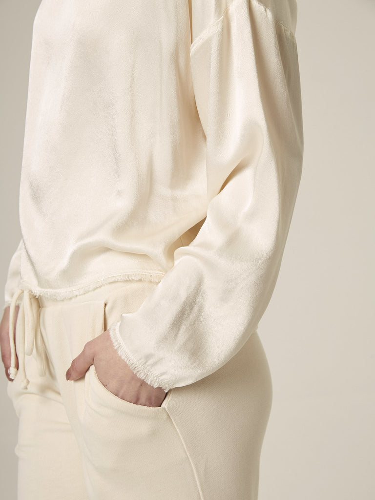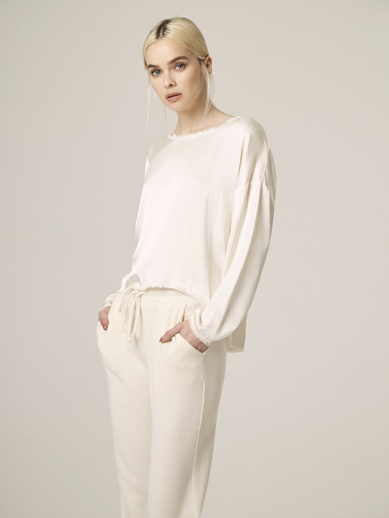 Experience an added edge on this feminine classic. The satin top features a raw edge that elevates a standard crewneck and the traditional fabric. With a relaxed fit, this winter white will take you through any season.