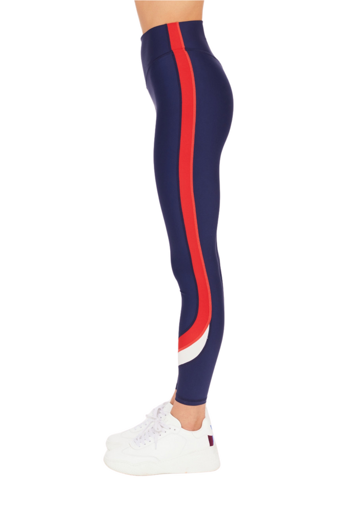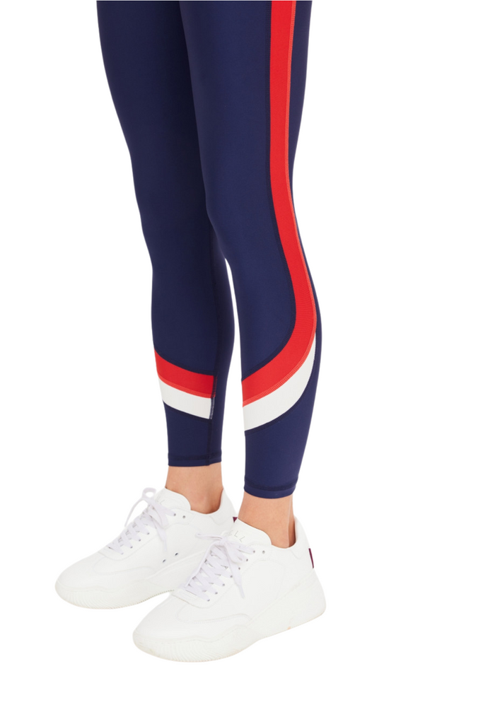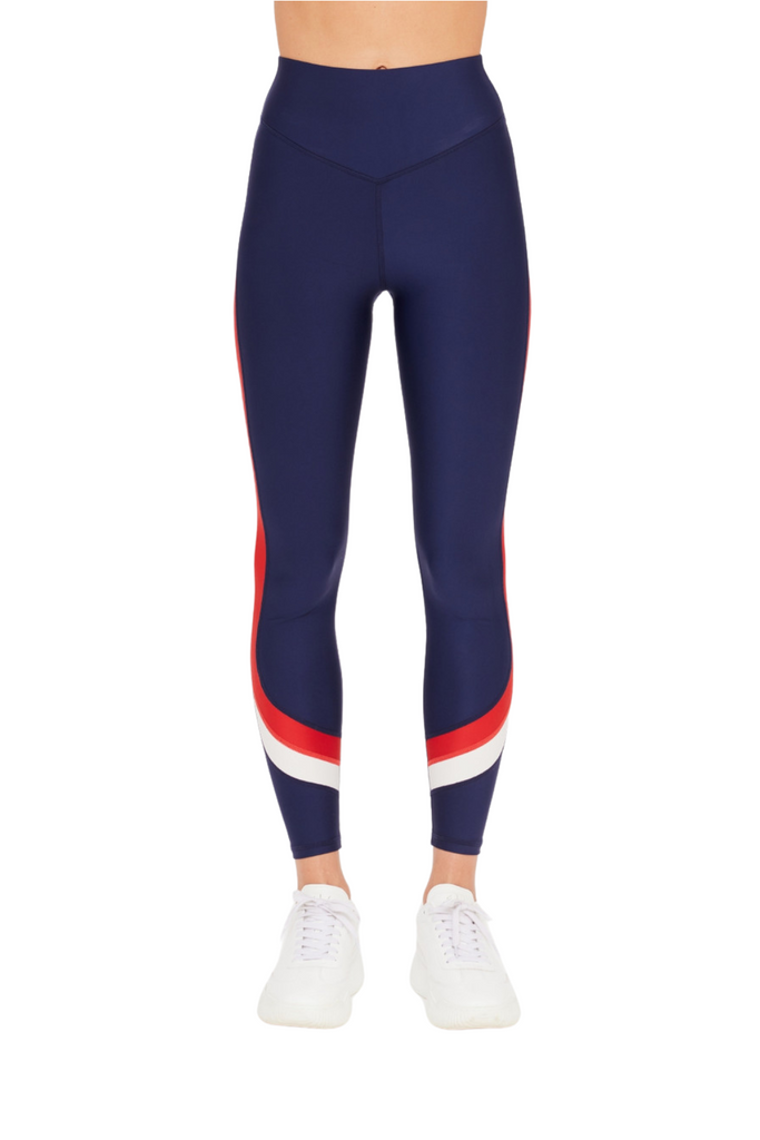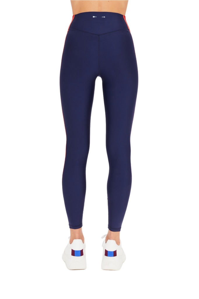 Add a dash of flair to your wardrobe with this classic color-block midi pant, featuring a 25" midi length leg and a V-shaped high-rise waistband for a flattering fit. Crafted from Eco Tech performance fabric, it offers breathability, quick drying, and moisture-wicking properties, accented with a contrast printed arrow at the back waistband for a touch of style.
