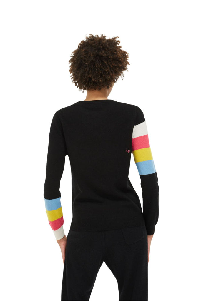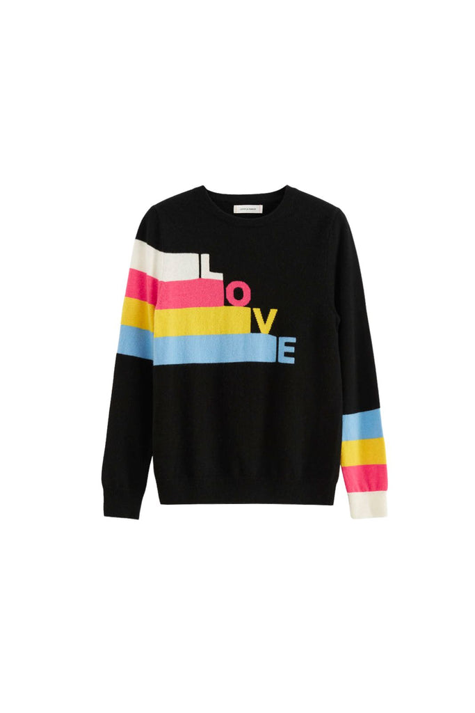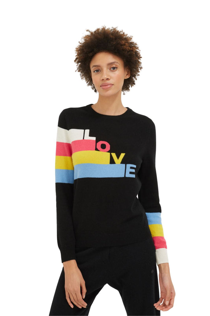 We are in ‘love’ with this sweater. The bold blocks of colors are stunning on the black background. It's the perfect knitted blend of wool and cashmere and you'll live in this sweater all winter long.