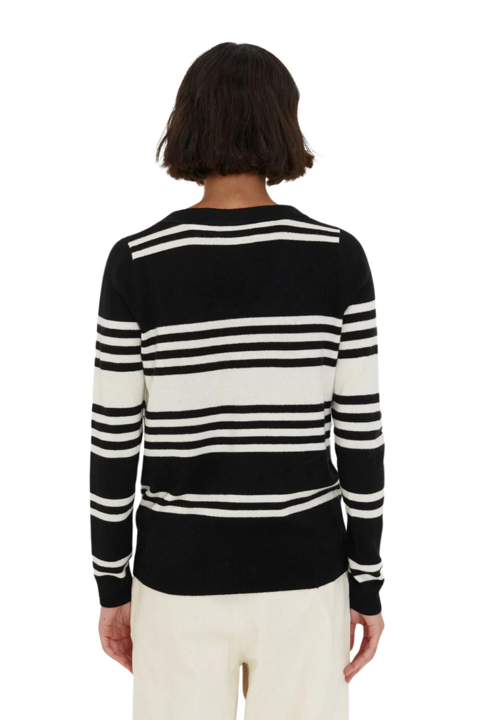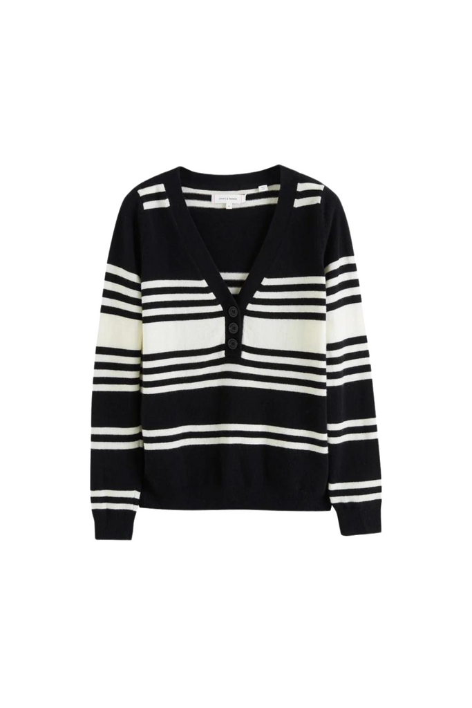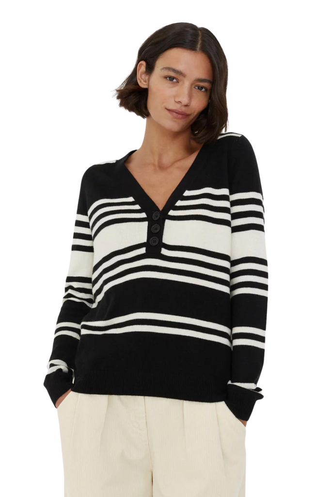 Channeling a vibe of French-girl-chic, the 'Camille' sweater effortlessly elevates your wardrobe with its timeless style. Crafted from a fine blend of wool and cashmere, it boasts a slim fit for a chic silhouette. The enduring black and white stripes, a button-fastening placket, and a flattering V-neck accentuate its elegant charm.