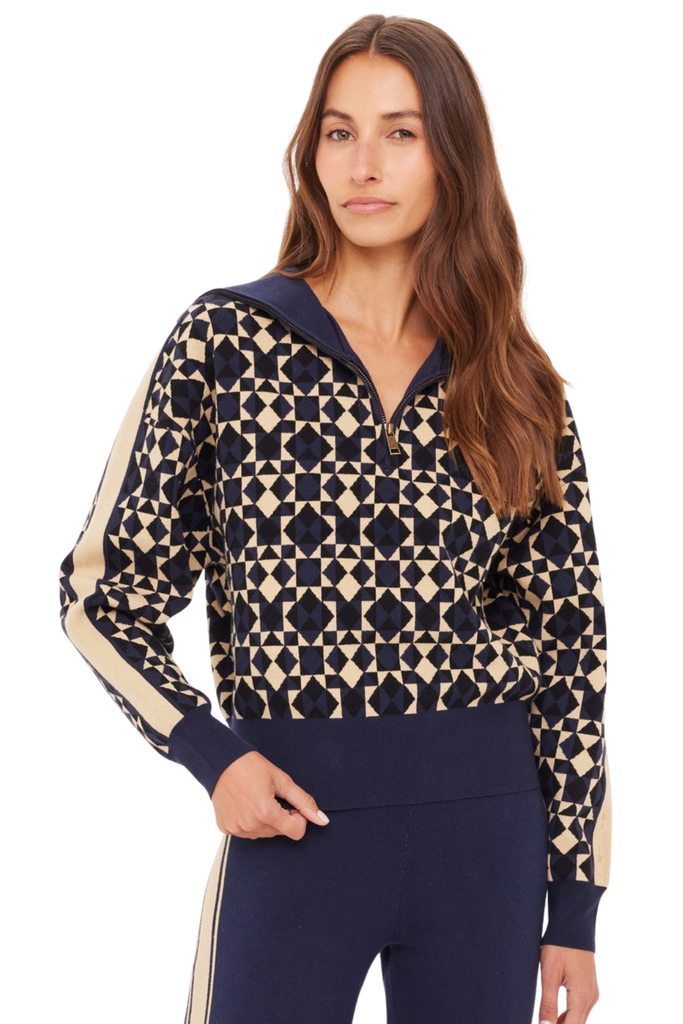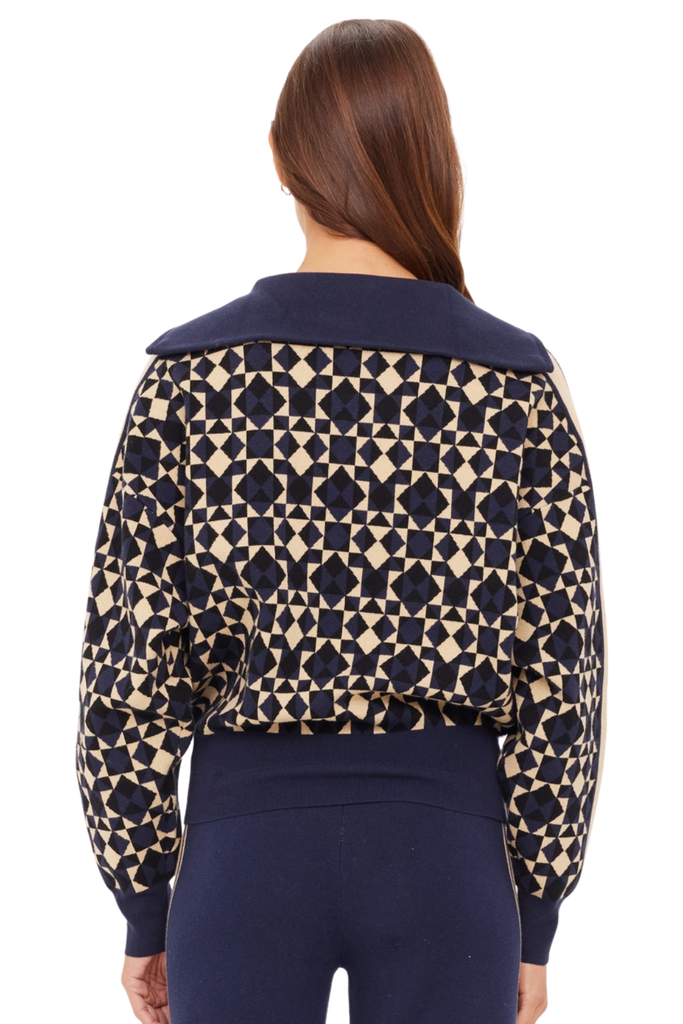 A modern knit essential with playful edge, the Cosmo Kairo Half Zip brings everyday wear to life with refined detail. Crafted from organic cotton in a jacquard knit, it showcases THE UPSIDE’s signature Cosmo geometric print, accented with beige stripes down the sleeves for a subtle contrast. The half-zip design is finished with an oversized ribbed collar, structured ribbed cuffs and hem, and a delicately embroidered arrow at the sleeve—an understated nod to the brand’s iconic aesthetic. Stylish yet comfortable, it’s an effortless piece to layer, lounge, and live in.