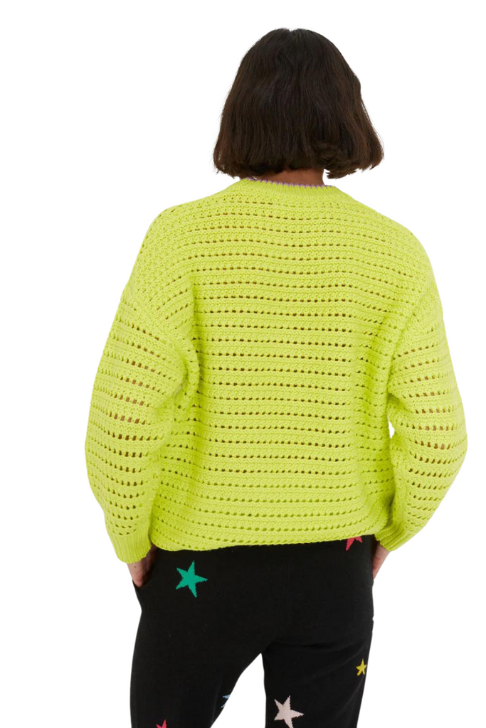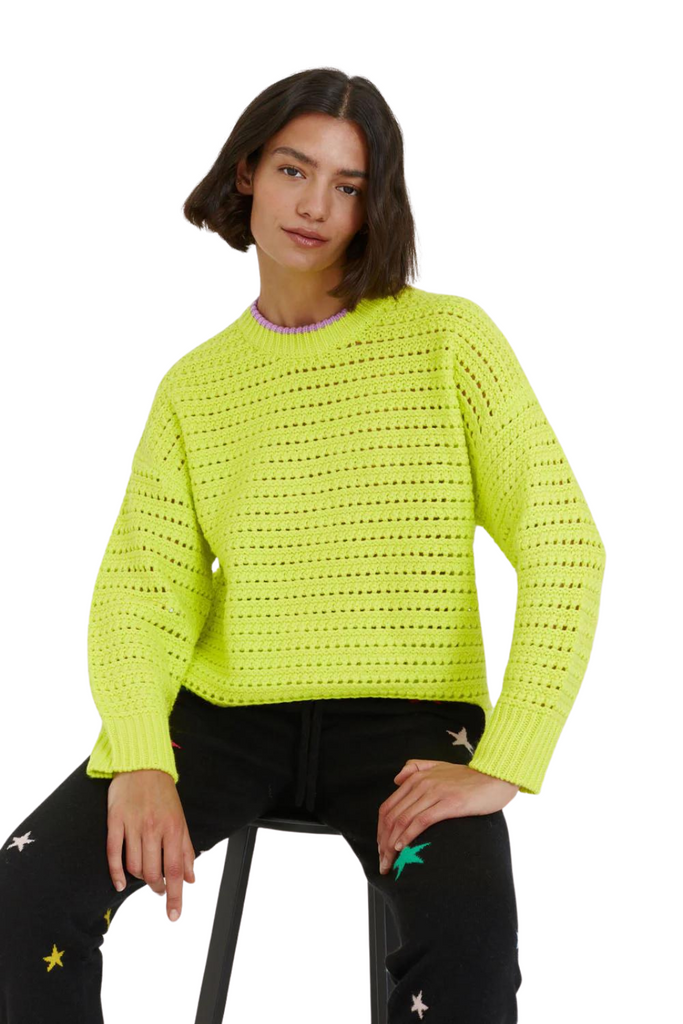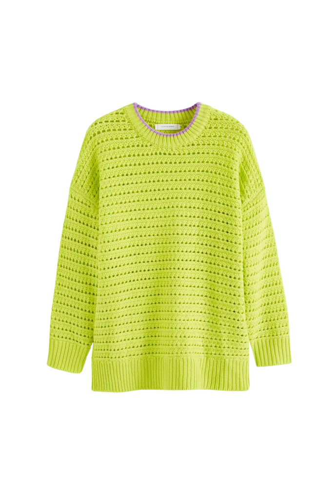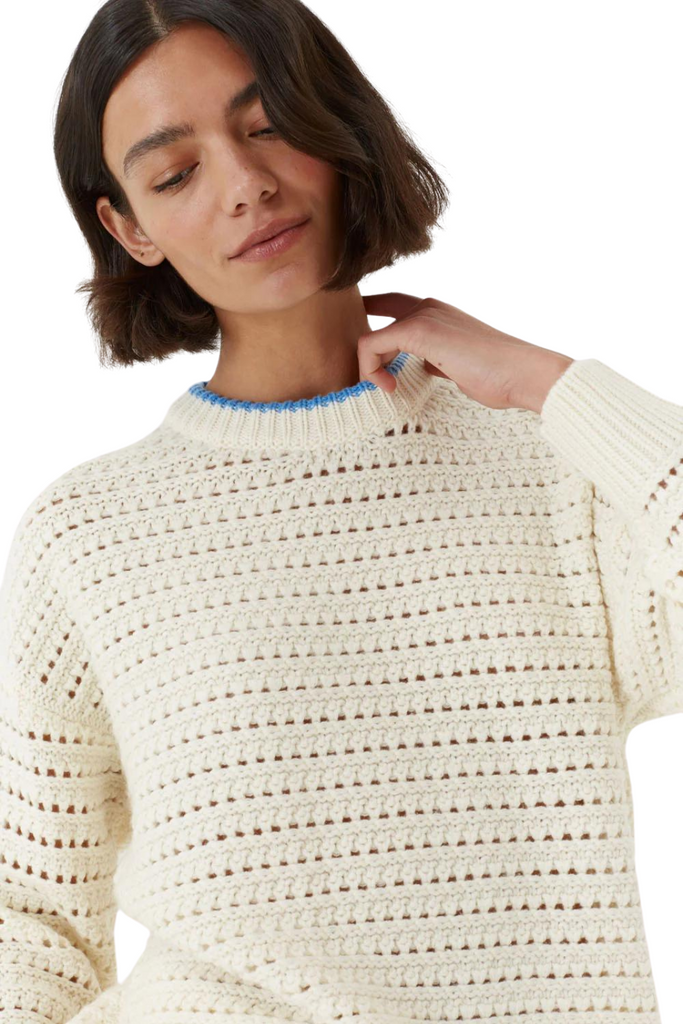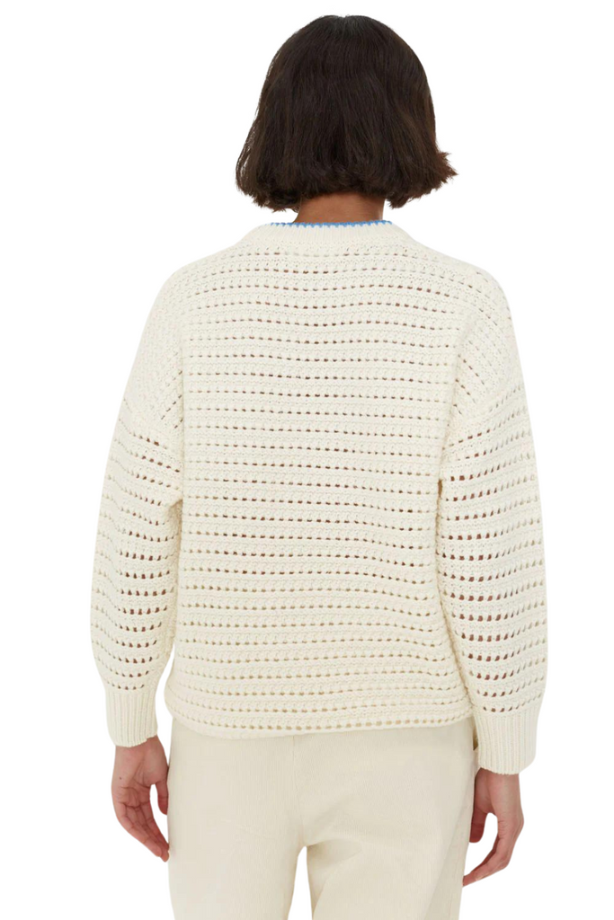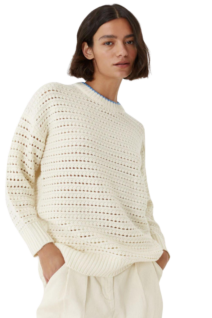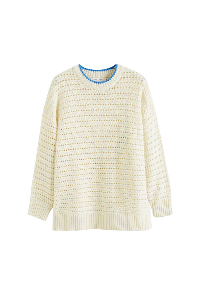 Infuse your wardrobe with rich texture by adding this chunky-knit sweater with a crochet stitch to your new season collection. The fresh cream and blue hues will add a touch of lightness and brightness to your cold-weather ensemble. Enhance the laid-back silhouette by pairing it with wide-leg pants or jeans.