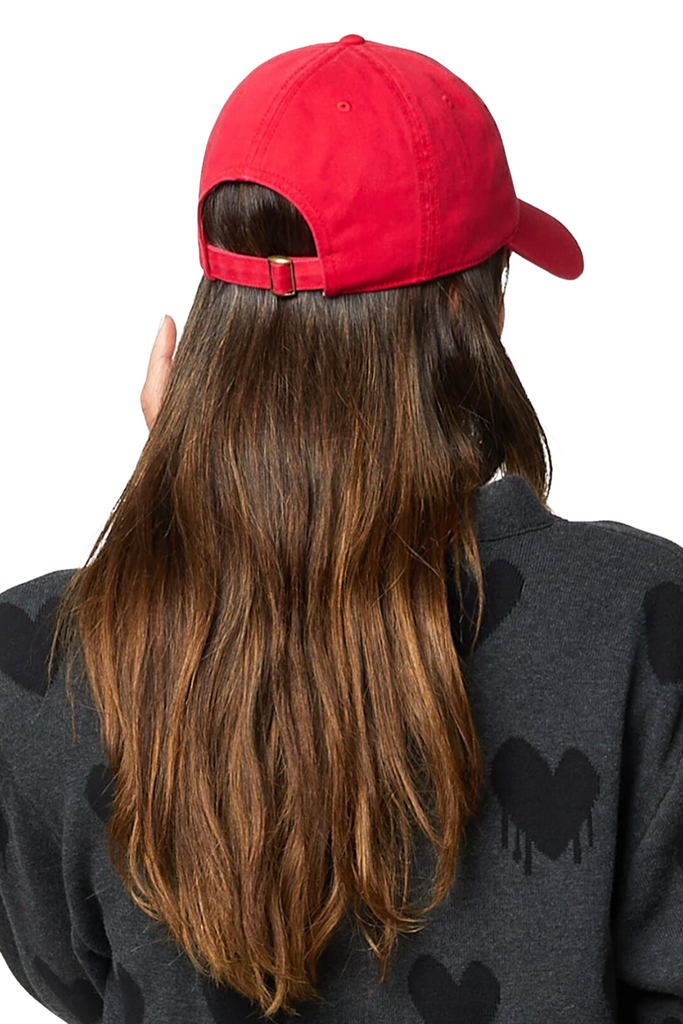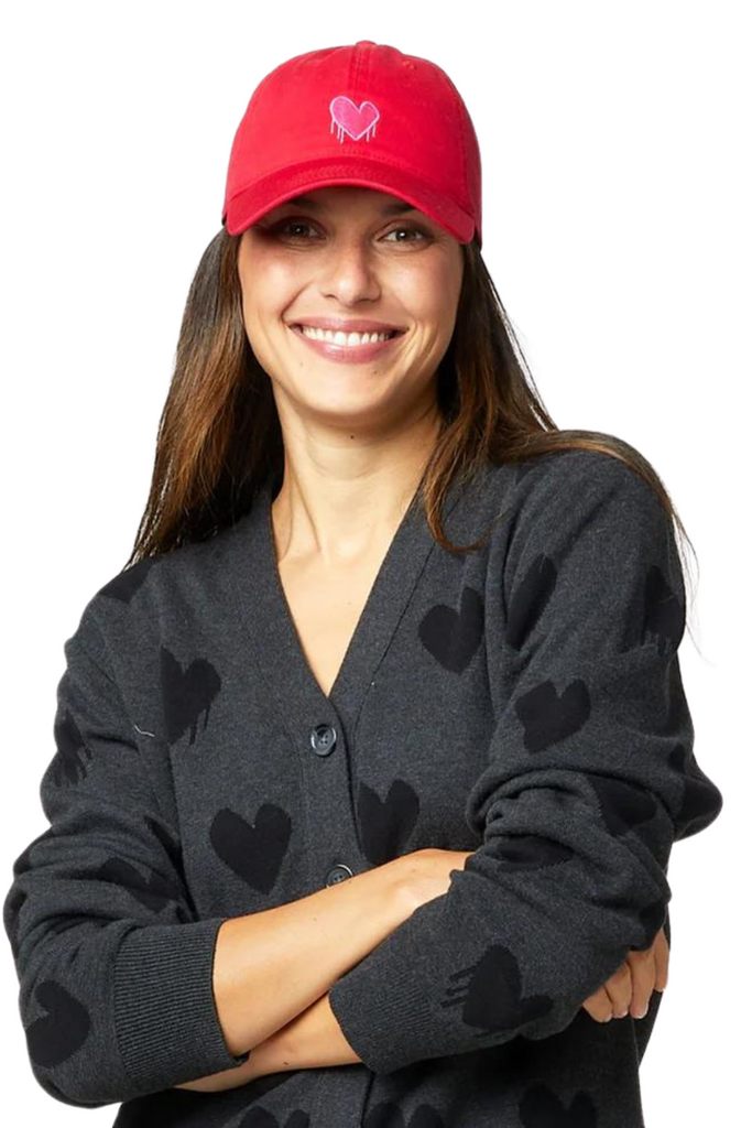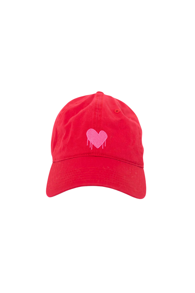 An ideal crimson baseball cap featuring the distinctive Drippy Heart embroidery by Kerri. Perfect for giving or receiving, it makes for a fantastic gift.