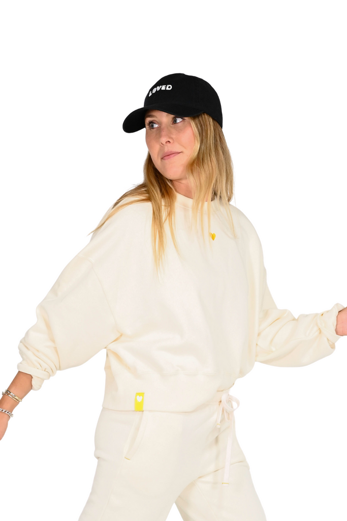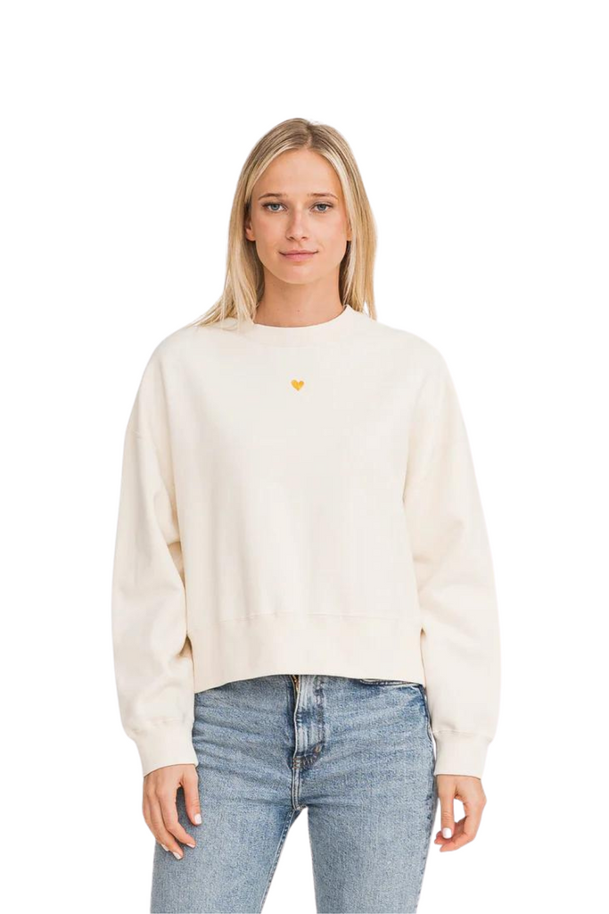 The Emily sweatshirt features a comfortable dolman sleeve and a super soft fleece material. It also boasts a tiny signature yellow stitched heart on the chest. This sweatshirt is made of 100% cotton and pairs perfectly with leggings or your favorite pair of jeans.