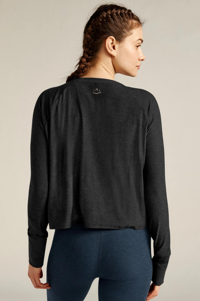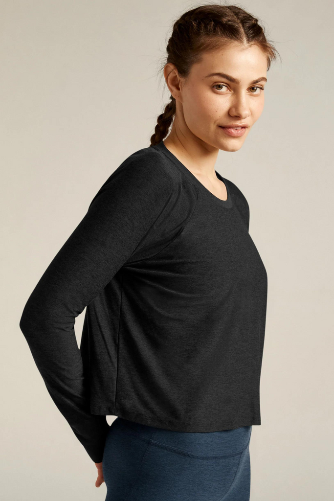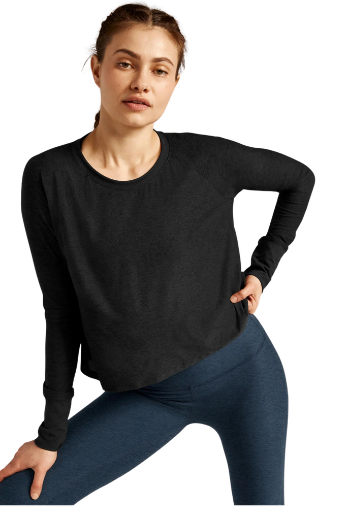 Experience the epitome of comfort with this buttery soft, lightweight long-sleeve tee, featuring raglan shoulders and a high hip length. Whether worn solo, layered under sweaters, or post-workout, this essential top effortlessly earns its place as a wardrobe staple, ready for any occasion.