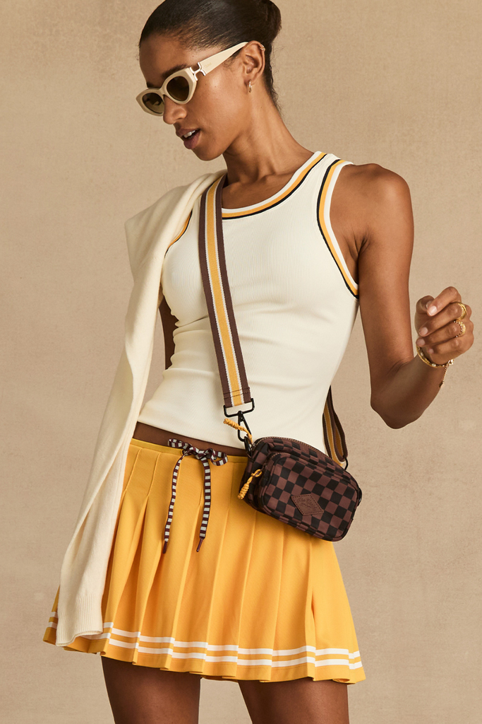 Up the ante in the Kirsty Rib Tank, crafted from recycled, moisture-wicking ribbed fabric in soft cream, finished with a striped neckline and armholes for a retro edge. Subtle arrow logo at the back adds the final touch.