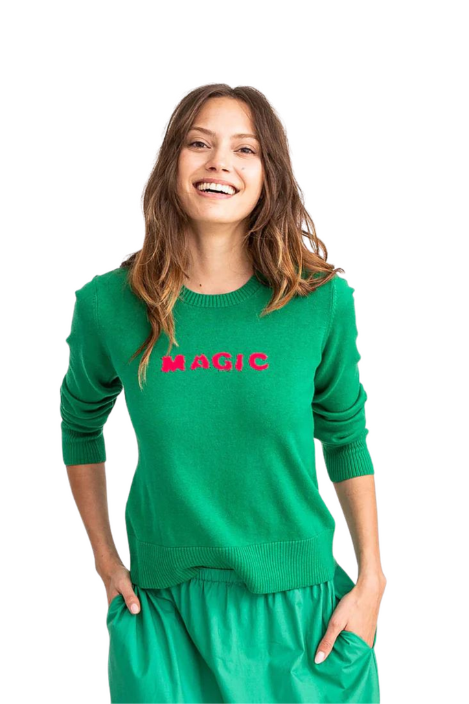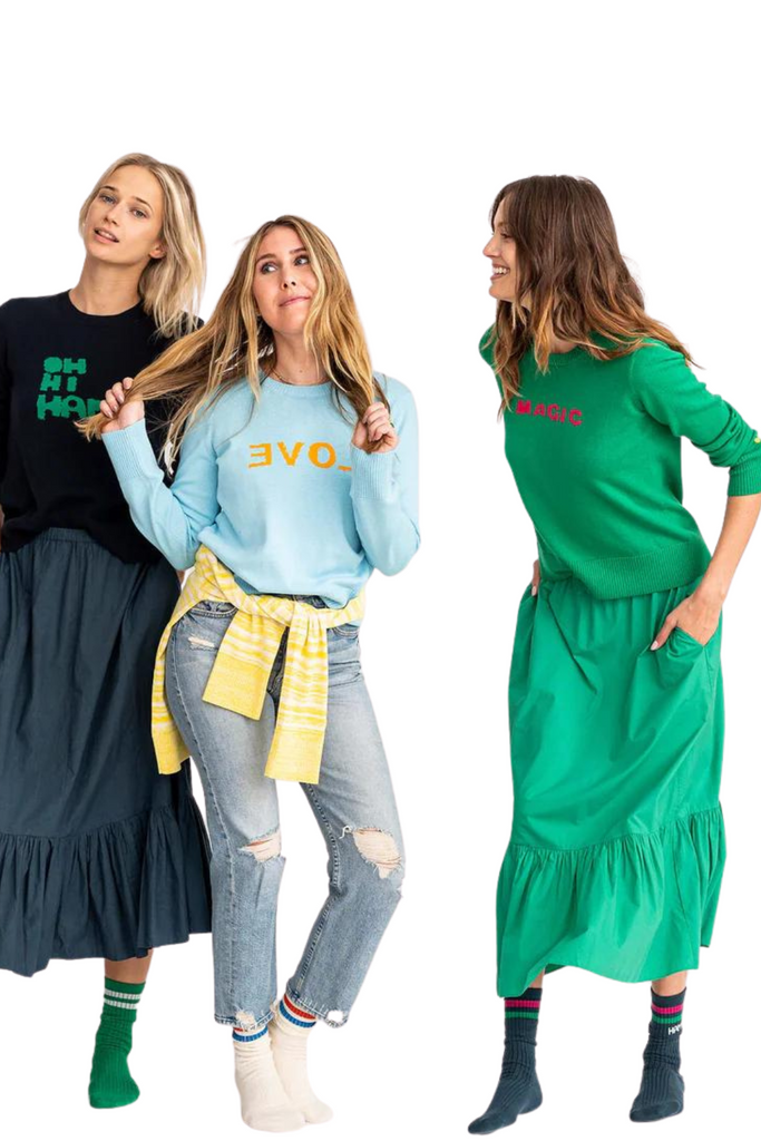 Kerri's new Liz Sweater, featuring the word "Magic", is inspired by Kerri's painting "It's Magic". Crafted from 100% cotton, this sweater captures the essence of the magic of love and life. We are absolutely enamored with this piece and we're sure you will be too.