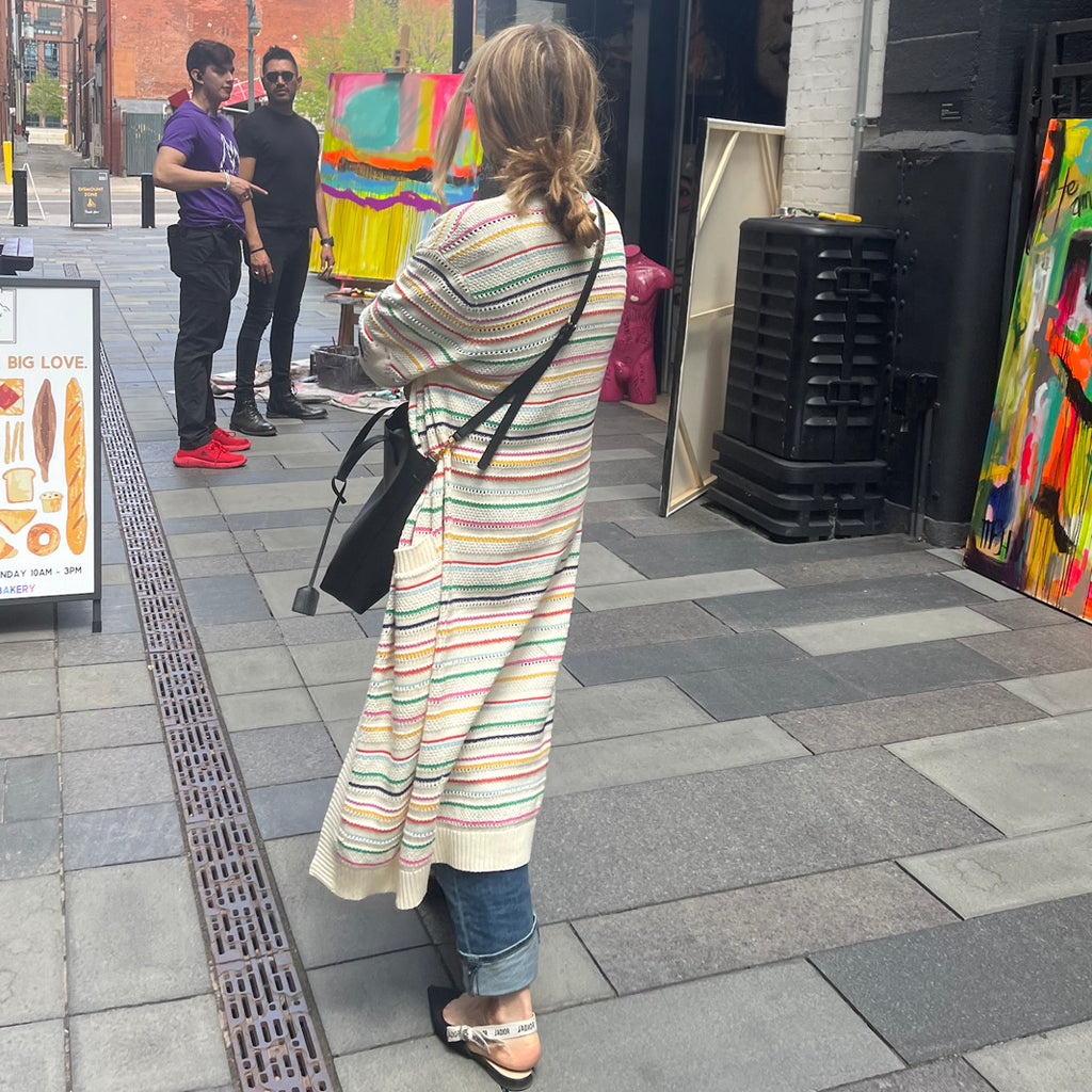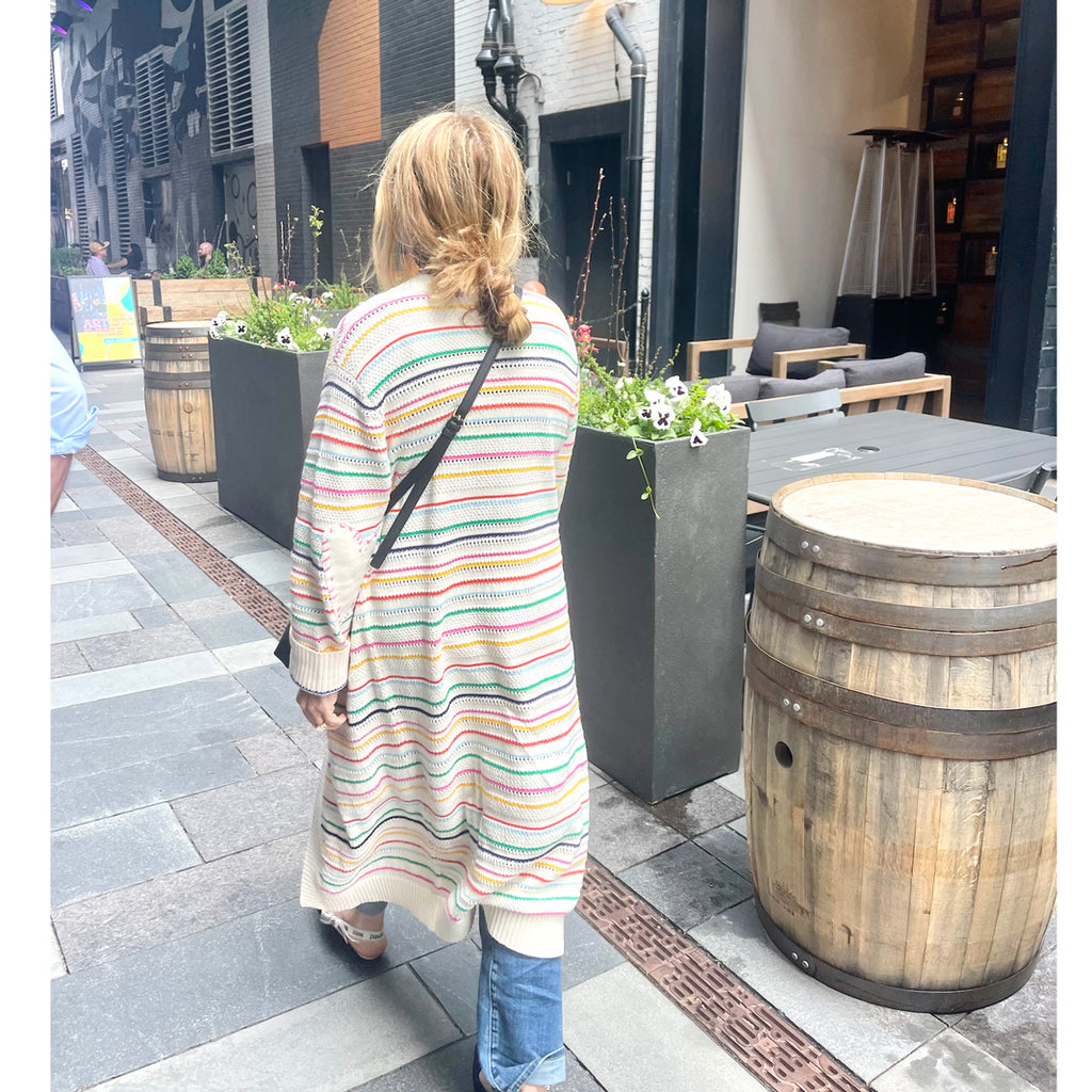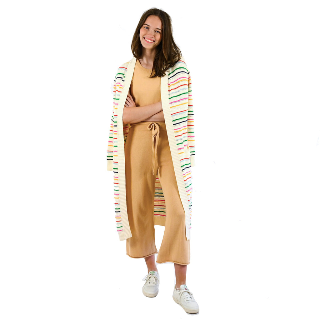 We are so in love with this long cardigan from Kerri Rosenthal. The luxurious cashmere, relaxed fit, and neutral tone are flattering and beautiful. We love to pair over leggings for an easy, effortless look.