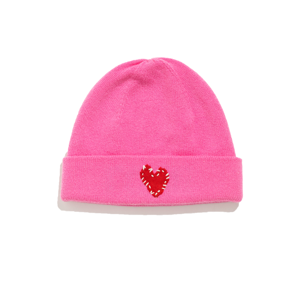 This cashmere beanie from Kerri Rosenthal is sure to send love to you and everyone else throughout the day. The beautiful color with the heart patch is the perfect amount of added detail. 100% Cashmere
