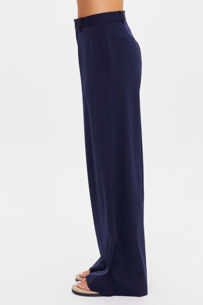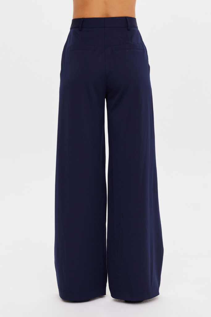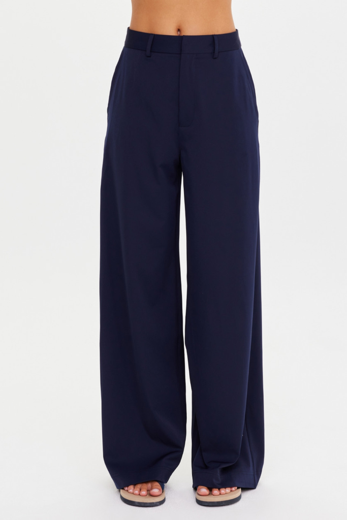 Refined yet versatile, the Mira Wide Leg Pant is designed to move seamlessly from day to night. Cut in a high-waisted silhouette with a structured waistband and tailored wide leg, it offers a clean, elongated fit that feels effortlessly elevated. Thoughtful details—including belt loops, a hook-and-eye and fly zip closure, and back welt pockets—bring a tailored finish, while its recycled polyester fabrication provides moisture-wicking, quick-drying comfort. Sleek, modern, and endlessly wearable, this navy staple pairs beautifully with both polished and relaxed looks.