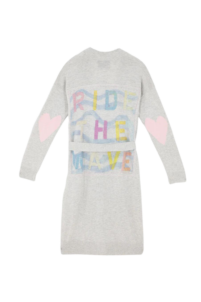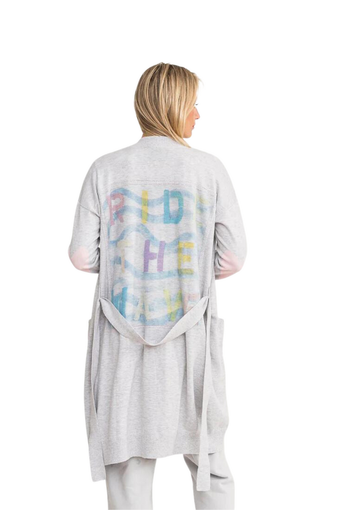 The London Cardigan showcases Kerri's captivating "Ride The Wave" artwork, complemented by endearing pink heart patches on the elbows. This cardigan serves as the ideal layer, effortlessly adaptable for both dressing up and dressing down.