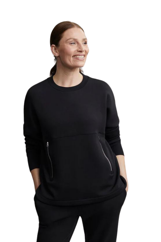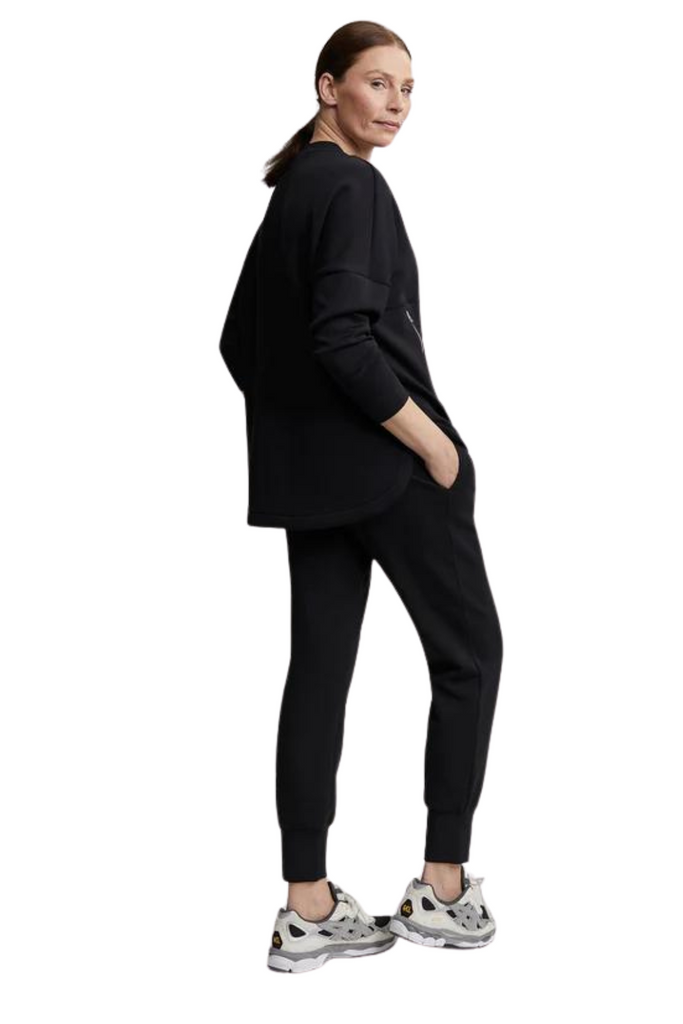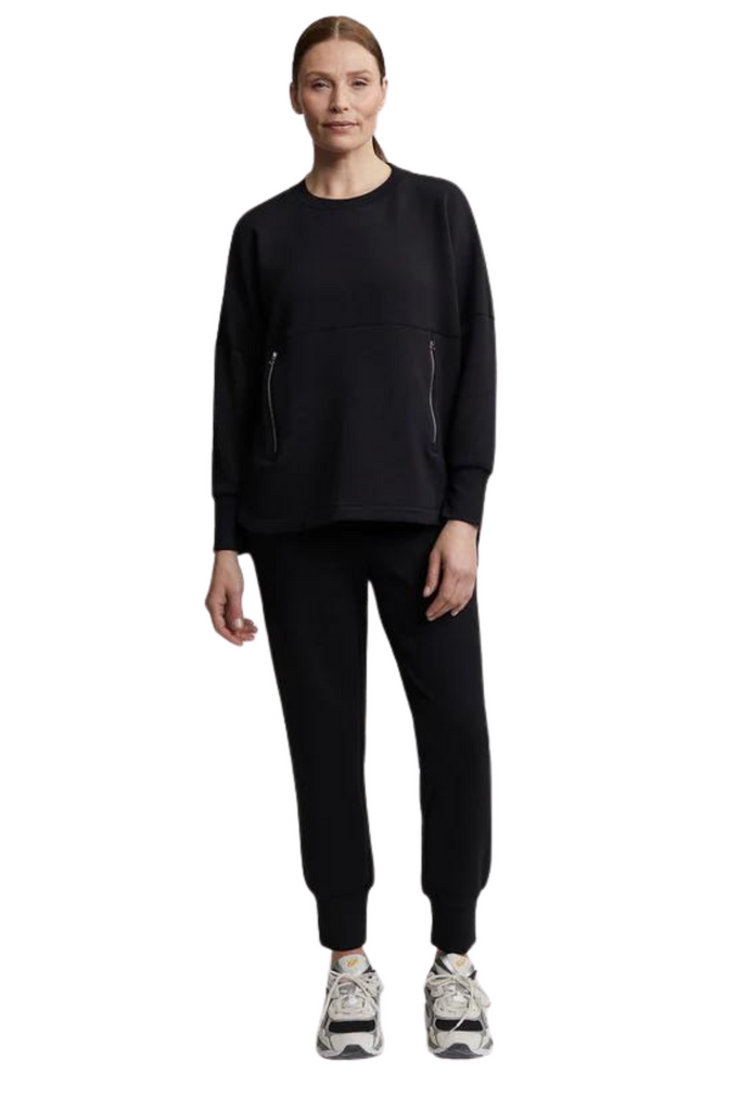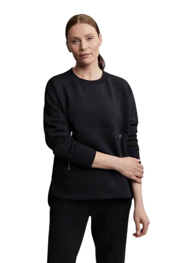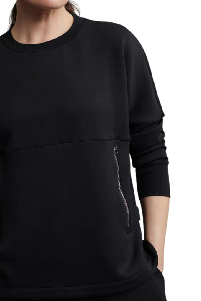 This elongated DoubleSoft sweatshirt effortlessly exudes sophistication. Highlighting a classic ribbed crew neck and a gracefully dropped back hem, this DoubleSoft garment stands as a versatile year-round essential. Perfect for layering and pairing, it seamlessly blends comfort with style.