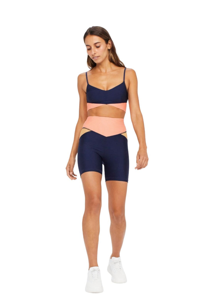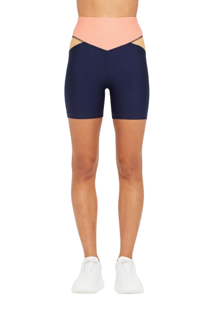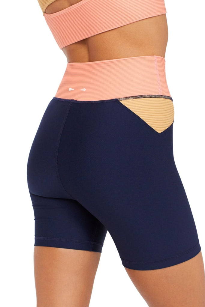 We are loving biker shorts for summer! These color-blocked, high-waisted, spin shorts are made with a matte tech performance fabric offering a breathable, quick-drying short -- perfect for any adventure in warm weather.