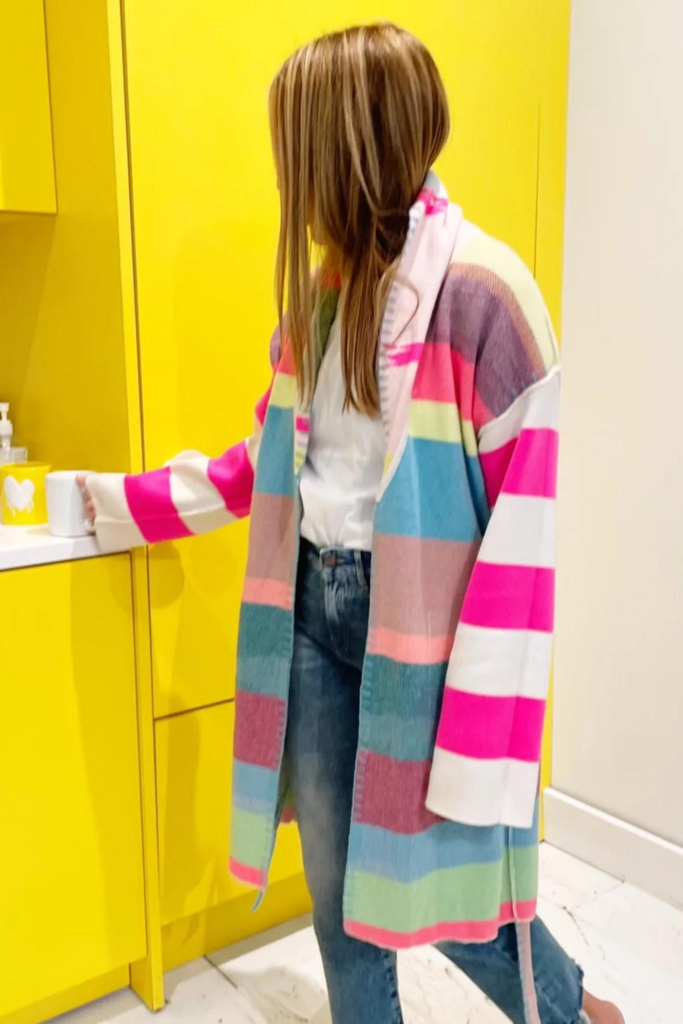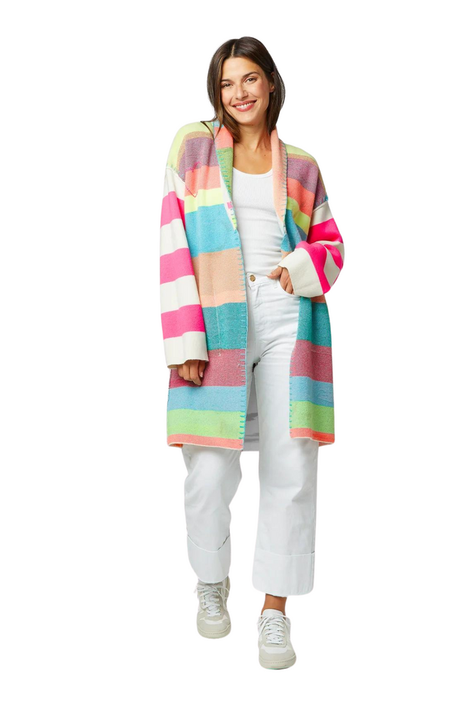 Inspired by her painting, Love And Other Stories, Kerri crafted this stylish cashmere duster, featuring a unique abstract design with striped sleeves. Incredibly comfortable and an ideal fall layer, you can reverse it for a completely different and versatile look.
