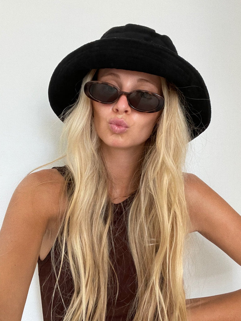 This classic terry bucket hat from Araminta James is the perfect summer accessory.