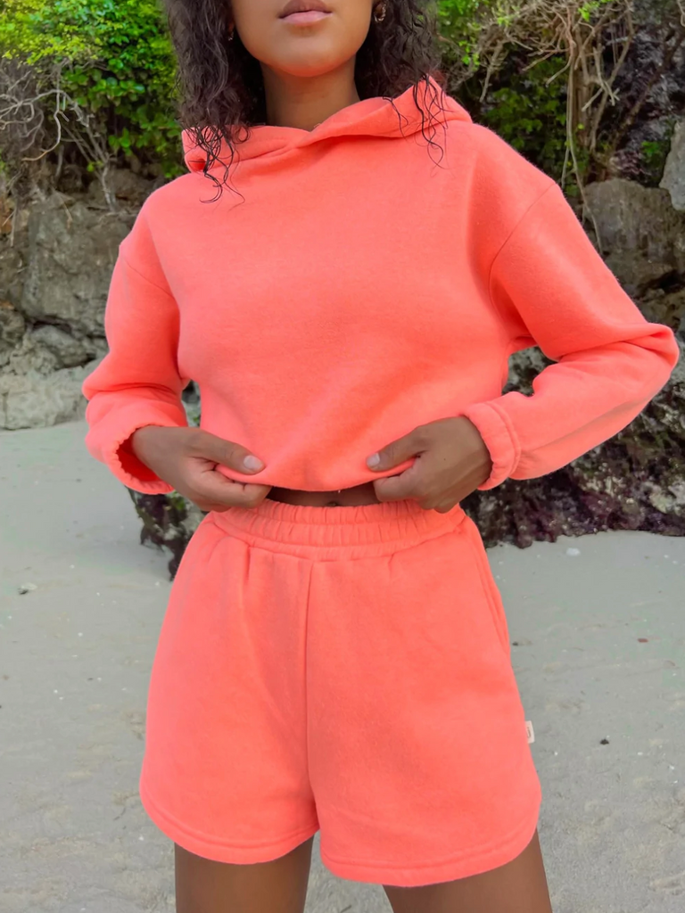 We are loving this color for summer! This hoodie is made with super cozy and soft premium fleece and features a cinched cropped hem. Pair it with the matching shorts for an elevated and casual look.