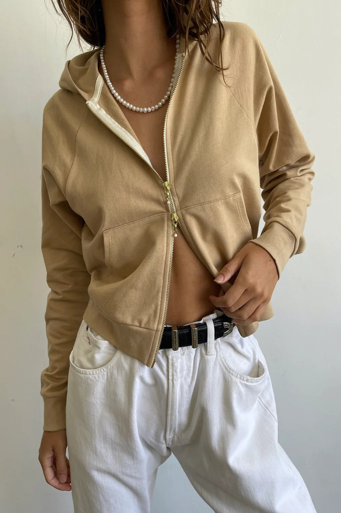 This vintage, cotton, zip-up sweatshirt is as comfy as it is flattering. We love to pair it with matching sweats for an effortless look.