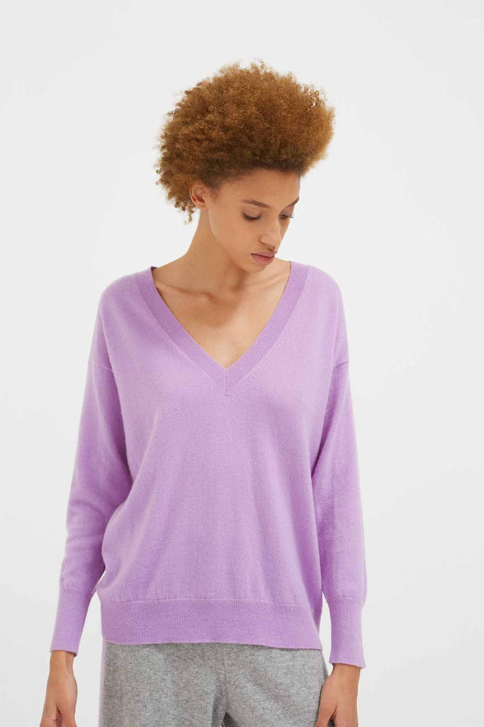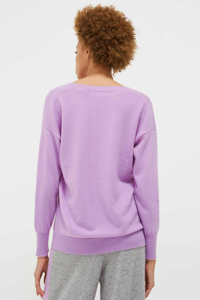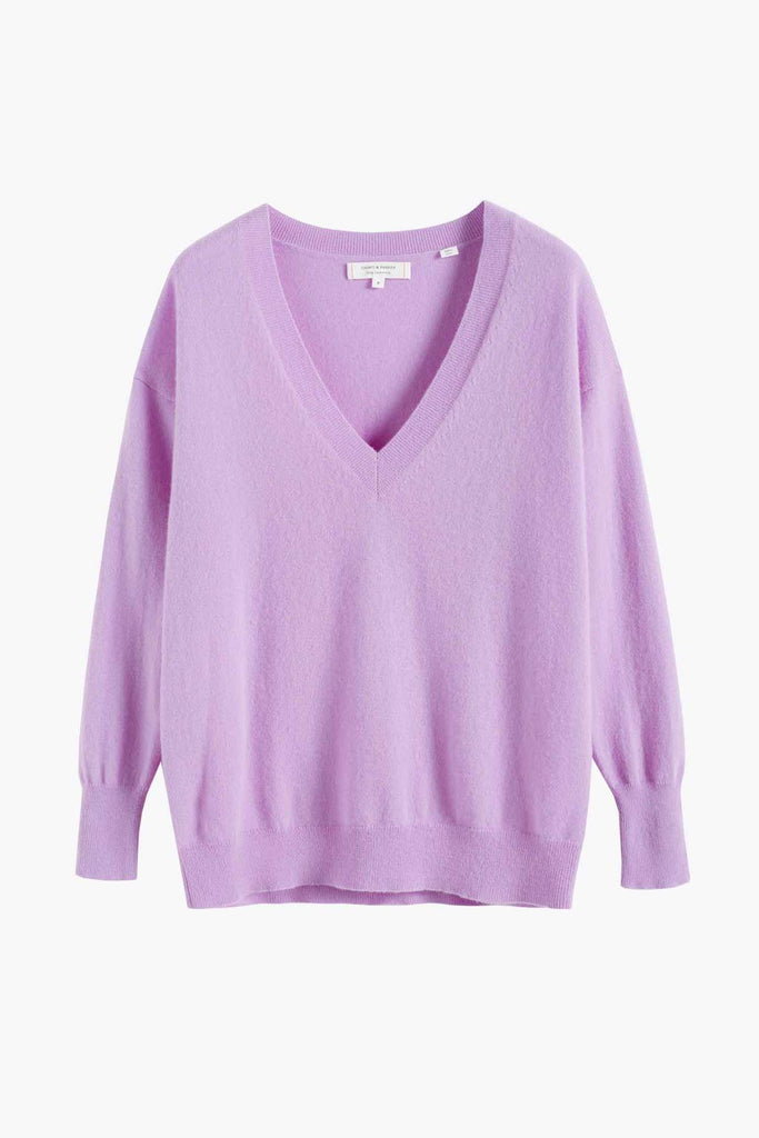 This cashmere sweater features a soft lilac; the perfect hue for spring. Crafted for a slouchy, relaxed fit, it features a V neckline and a pocket on the sleeve. You will wear this comfy piece time and again.