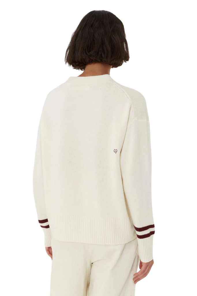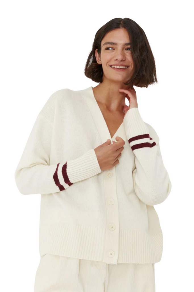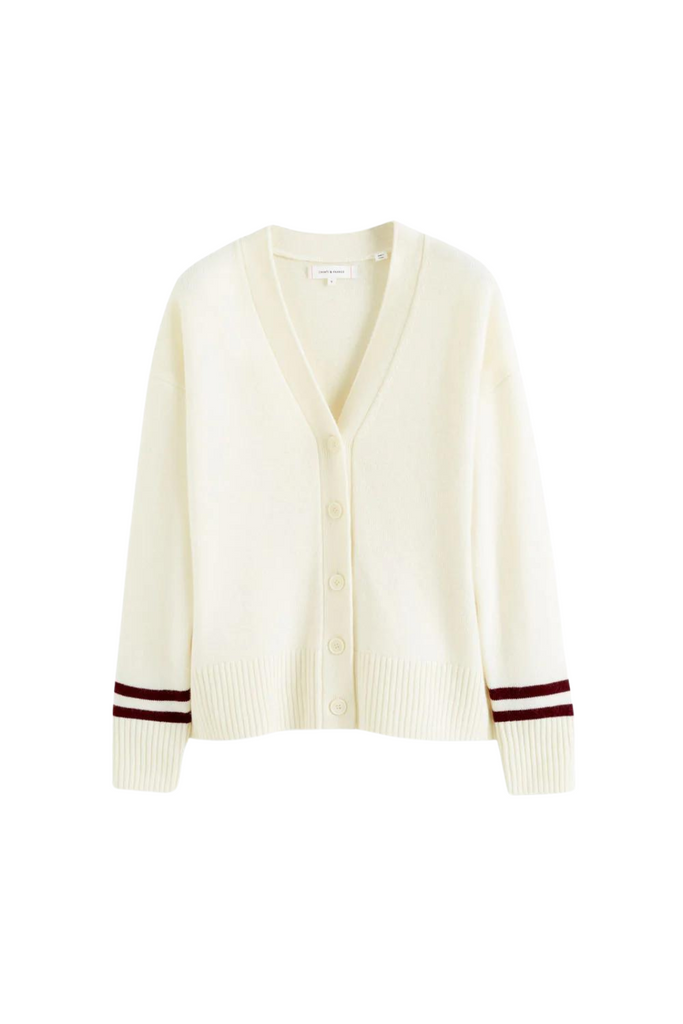 Revitalize your winter wardrobe with this cream cardigan, meticulously crafted from a luxurious blend of wool and cashmere. Designed with drop shoulders for a laid-back fit, it's a versatile piece that effortlessly complements both track pants and jeans. Take note of the claret stripes above the cuffs, adding a sporty finishing touch to the look.