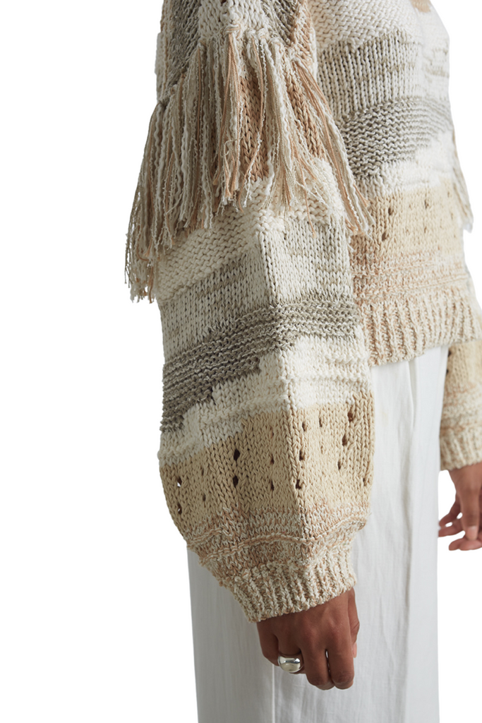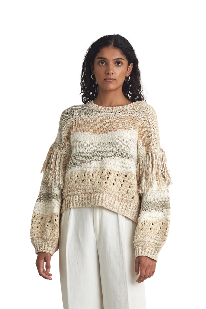 The Zora sweater is an emotive piece with a neutral color palette and intricate intarsia patterning, complete with fringe detailing on the sleeves. Made from a blend of cotton tape and cord yarns, it has a perfect weight for transitional seasons. With a flattering cropped fit, the Zora is ideal for pairing with your favorite high-waisted pants, whether worn fully tucked in or left out.